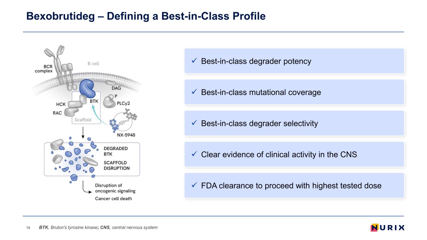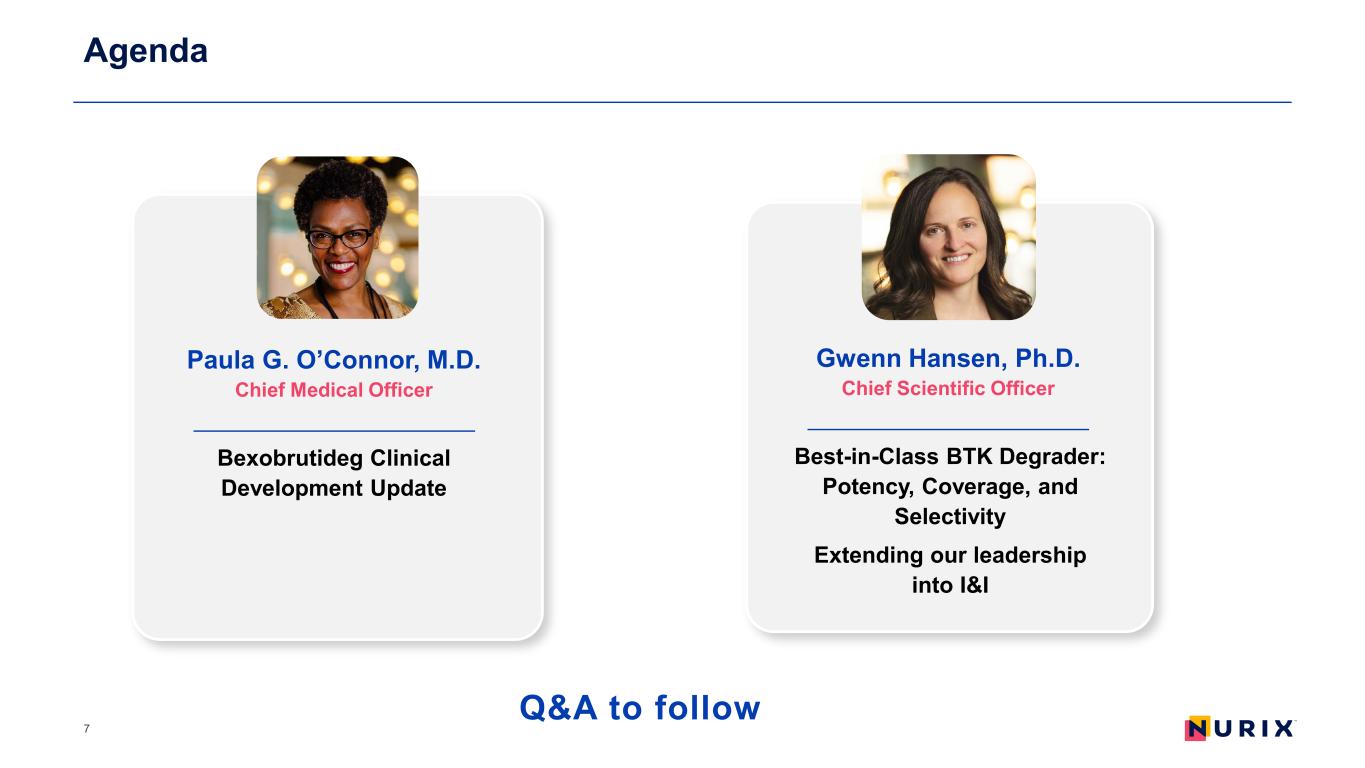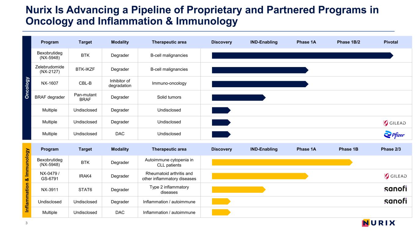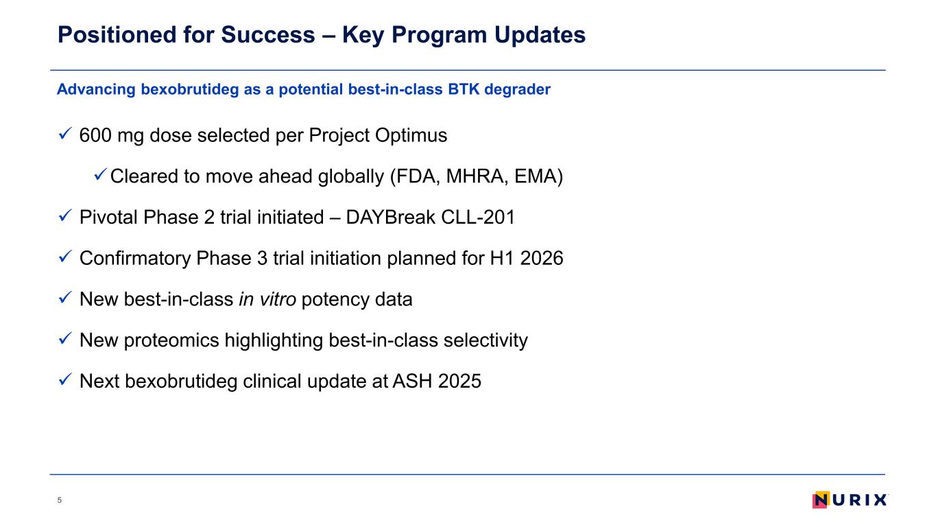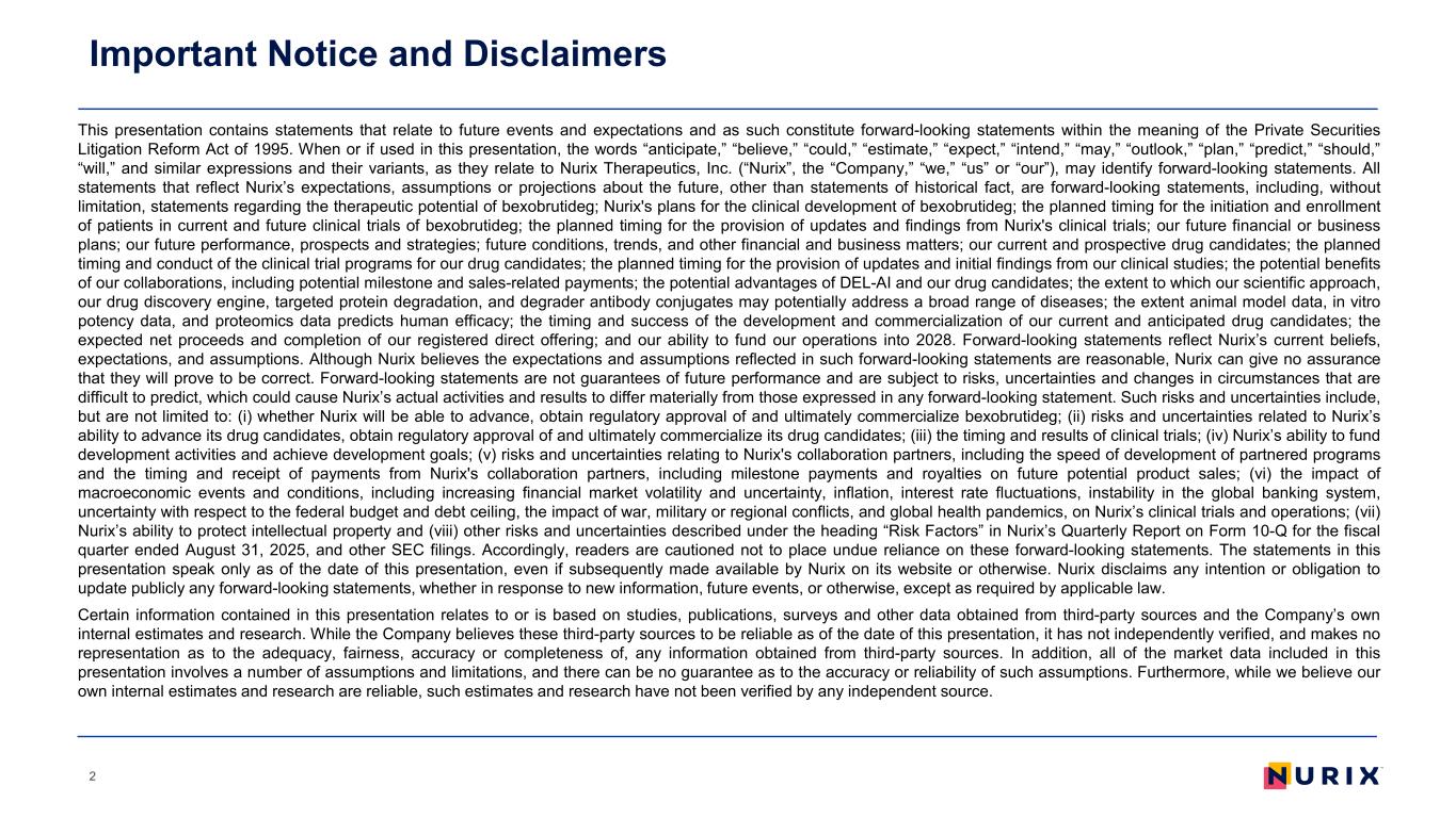 Important Notice and Disclaimers This presentation contains statements that relate to future events and expectations and as such constitute forward-looking statements within the meaning of the Private Securities Litigation Reform Act of 1995. When or if used in this presentation, the words “anticipate,” “believe,” “could,” “estimate,” “expect,” “intend,” “may,” “outlook,” “plan,” “predict,” “should,” “will,” and similar expressions and their variants, as they relate to Nurix Therapeutics, Inc. (“Nurix”, the “Company,” “we,” “us” or “our”), may identify forward-looking statements. All statements that reflect Nurix’s expectations, assumptions or projections about the future, other than statements of historical fact, are forward-looking statements, including, without limitation, statements regarding the therapeutic potential of bexobrutideg; Nurix's plans for the clinical development of bexobrutideg; the planned timing for the initiation and enrollment of patients in current and future clinical trials of bexobrutideg; the planned timing for the provision of updates and findings from Nurix's clinical trials; our future financial or business plans; our future performance, prospects and strategies; future conditions, trends, and other financial and business matters; our current and prospective drug candidates; the planned timing and conduct of the clinical trial programs for our drug candidates; the planned timing for the provision of updates and initial findings from our clinical studies; the potential benefits of our collaborations, including potential milestone and sales-related payments; the potential advantages of DEL-AI and our drug candidates; the extent to which our scientific approach, our drug discovery engine, targeted protein degradation, and degrader antibody conjugates may potentially address a broad range of diseases; the extent animal model data, in vitro potency data, and proteomics data predicts human efficacy; the timing and success of the development and commercialization of our current and anticipated drug candidates; the expected net proceeds and completion of our registered direct offering; and our ability to fund our operations into 2028. Forward-looking statements reflect Nurix’s current beliefs, expectations, and assumptions. Although Nurix believes the expectations and assumptions reflected in such forward-looking statements are reasonable, Nurix can give no assurance that they will prove to be correct. Forward-looking statements are not guarantees of future performance and are subject to risks, uncertainties and changes in circumstances that are difficult to predict, which could cause Nurix’s actual activities and results to differ materially from those expressed in any forward-looking statement. Such risks and uncertainties include, but are not limited to: (i) whether Nurix will be able to advance, obtain regulatory approval of and ultimately commercialize bexobrutideg; (ii) risks and uncertainties related to Nurix’s ability to advance its drug candidates, obtain regulatory approval of and ultimately commercialize its drug candidates; (iii) the timing and results of clinical trials; (iv) Nurix’s ability to fund development activities and achieve development goals; (v) risks and uncertainties relating to Nurix's collaboration partners, including the speed of development of partnered programs and the timing and receipt of payments from Nurix's collaboration partners, including milestone payments and royalties on future potential product sales; (vi) the impact of macroeconomic events and conditions, including increasing financial market volatility and uncertainty, inflation, interest rate fluctuations, instability in the global banking system, uncertainty with respect to the federal budget and debt ceiling, the impact of war, military or regional conflicts, and global health pandemics, on Nurix’s clinical trials and operations; (vii) Nurix’s ability to protect intellectual property and (viii) other risks and uncertainties described under the heading “Risk Factors” in Nurix’s Quarterly Report on Form 10-Q for the fiscal quarter ended August 31, 2025, and other SEC filings. Accordingly, readers are cautioned not to place undue reliance on these forward-looking statements. The statements in this presentation speak only as of the date of this presentation, even if subsequently made available by Nurix on its website or otherwise. Nurix disclaims any intention or obligation to update publicly any forward-looking statements, whether in response to new information, future events, or otherwise, except as required by applicable law. Certain information contained in this presentation relates to or is based on studies, publications, surveys and other data obtained from third-party sources and the Company’s own internal estimates and research. While the Company believes these third-party sources to be reliable as of the date of this presentation, it has not independently verified, and makes no representation as to the adequacy, fairness, accuracy or completeness of, any information obtained from third-party sources. In addition, all of the market data included in this presentation involves a number of assumptions and limitations, and there can be no guarantee as to the accuracy or reliability of such assumptions. Furthermore, while we believe our own internal estimates and research are reliable, such estimates and research have not been verified by any independent source. 2