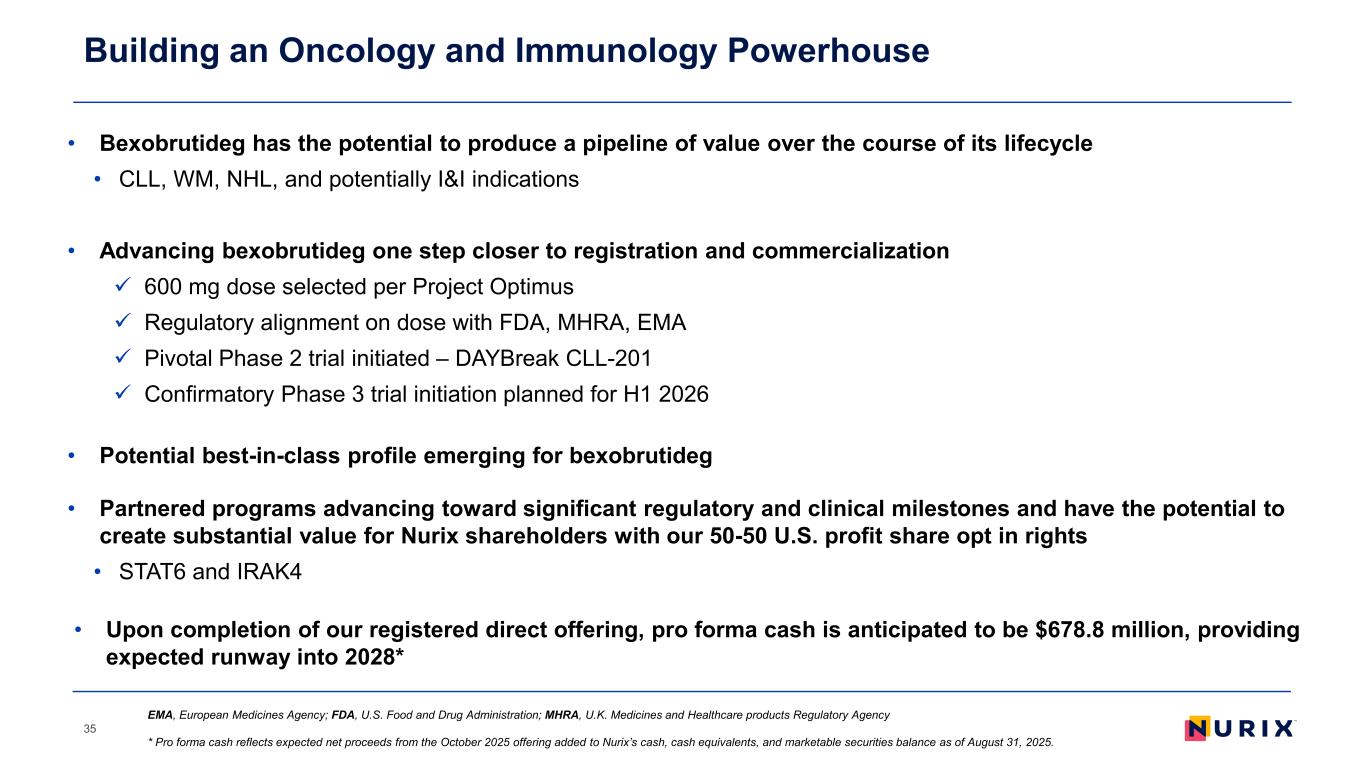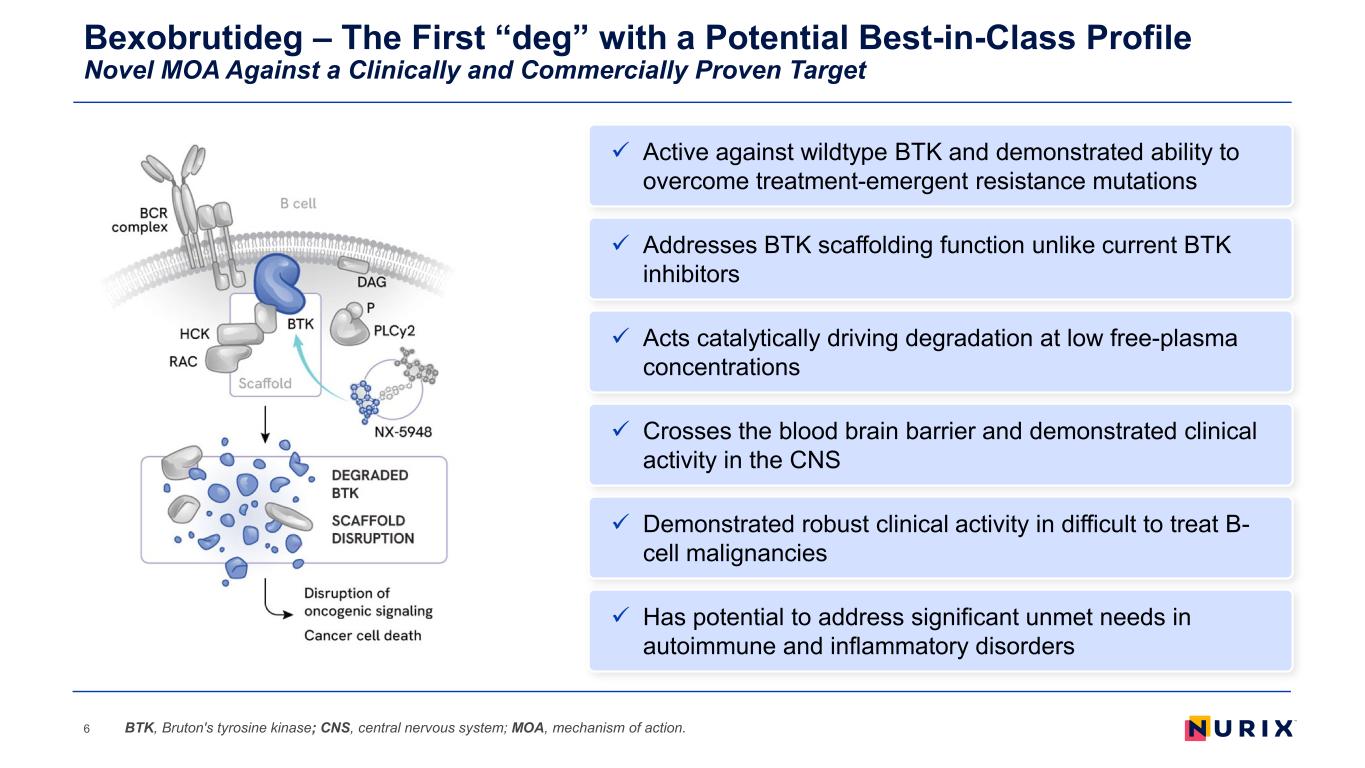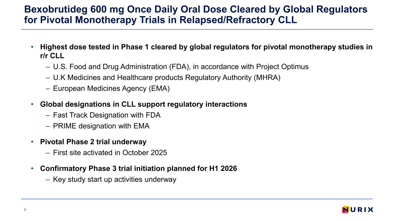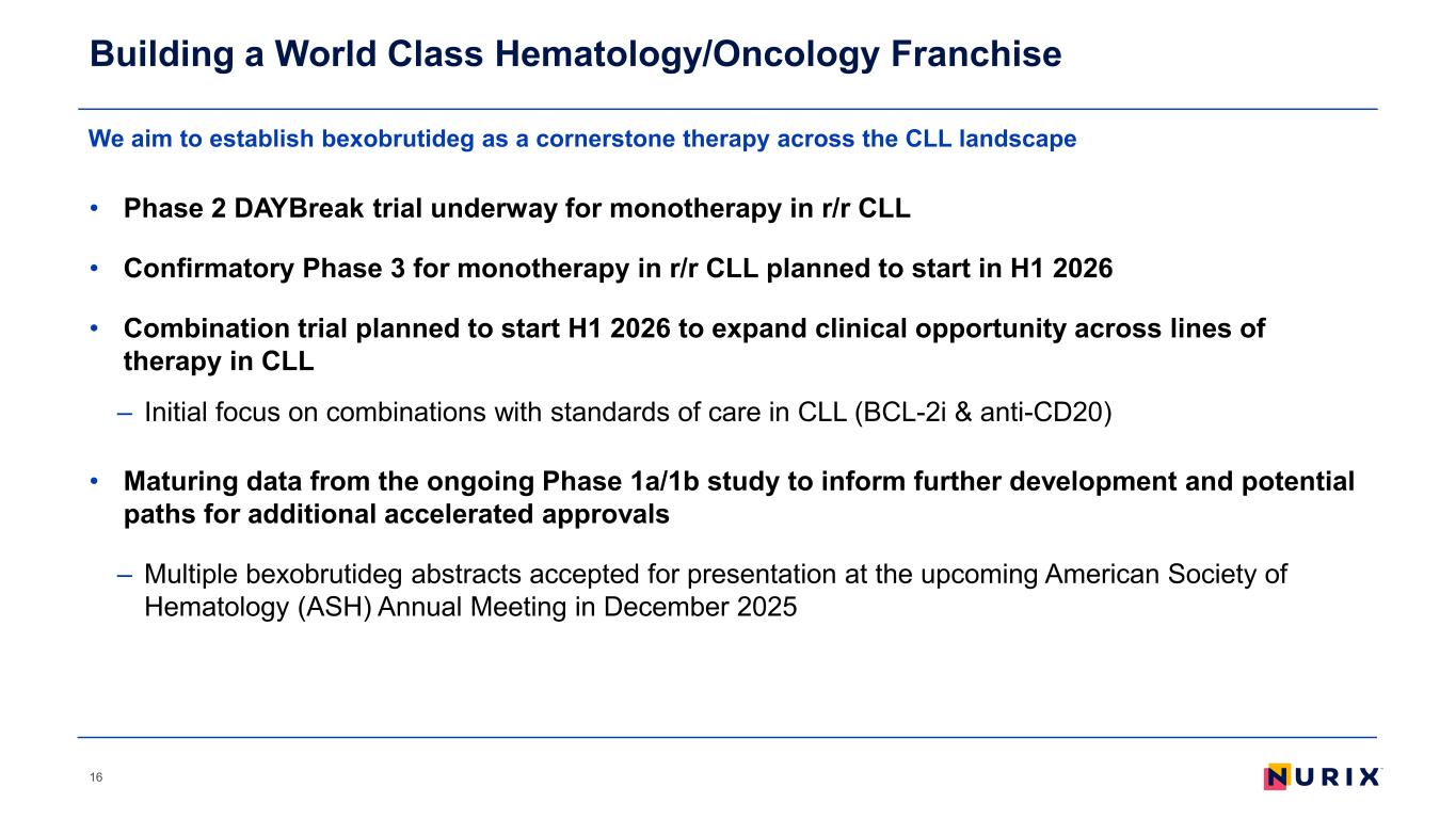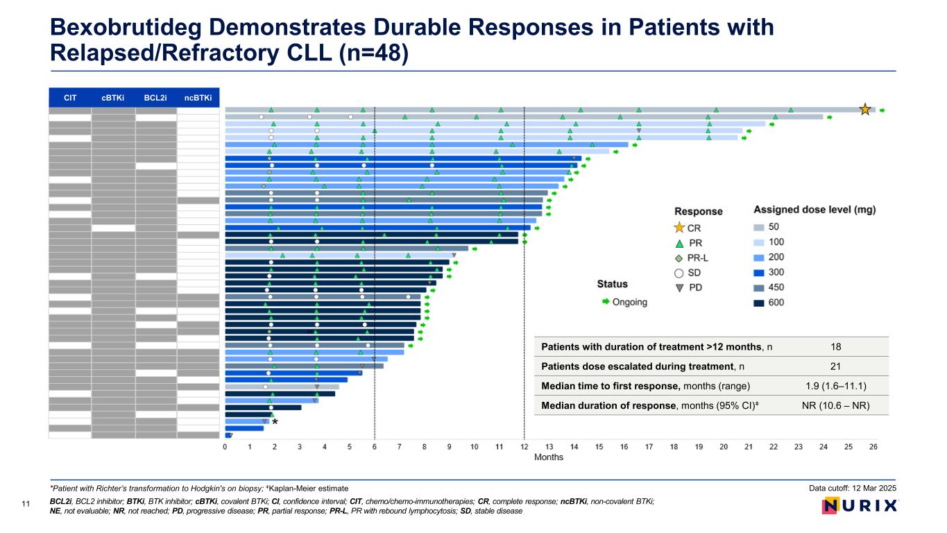 Important Notice and Disclaimers This presentation contains statements that relate to future events and expectations and as such constitute forward-looking statements within the meaning of the Private Securities Litigation Reform Act of 1995. When or if used in this presentation, the words “anticipate,” “believe,” “could,” “estimate,” “expect,” “intend,” “may,” “outlook,” “plan,” “predict,” “should,” “will,” and similar expressions and their variants, as they relate to Nurix Therapeutics, Inc. (“Nurix”, the “Company,” “we,” “us” or “our”), may identify forward-looking statements. All statements that reflect Nurix’s expectations, assumptions or projections about the future, other than statements of historical fact, are forward-looking statements, including, without limitation, statements regarding the therapeutic potential of bexobrutideg; Nurix's plans for the clinical development of bexobrutideg; the planned timing for the initiation and enrollment of patients in current and future clinical trials of bexobrutideg; the planned timing for the provision of updates and findings from Nurix's clinical trials; our future financial or business plans; our future performance, prospects and strategies; future conditions, trends, and other financial and business matters; our current and prospective drug candidates; the planned timing and conduct of the clinical trial programs for our drug candidates; the planned timing for the provision of updates and initial findings from our clinical studies; the potential benefits of our collaborations, including potential milestone and sales-related payments; the potential advantages of DEL-AI and our drug candidates; the extent to which our scientific approach, our drug discovery engine, targeted protein degradation, and degrader antibody conjugates may potentially address a broad range of diseases; the extent animal model data, in vitro potency data, and proteomics data predicts human efficacy; the timing and success of the development and commercialization of our current and anticipated drug candidates; the expected net proceeds and completion of our registered direct offering; and our ability to fund our operations into 2028. Forward-looking statements reflect Nurix’s current beliefs, expectations, and assumptions. Although Nurix believes the expectations and assumptions reflected in such forward-looking statements are reasonable, Nurix can give no assurance that they will prove to be correct. Forward-looking statements are not guarantees of future performance and are subject to risks, uncertainties and changes in circumstances that are difficult to predict, which could cause Nurix’s actual activities and results to differ materially from those expressed in any forward-looking statement. Such risks and uncertainties include, but are not limited to: (i) whether Nurix will be able to advance, obtain regulatory approval of and ultimately commercialize bexobrutideg; (ii) risks and uncertainties related to Nurix’s ability to advance its drug candidates, obtain regulatory approval of and ultimately commercialize its drug candidates; (iii) the timing and results of clinical trials; (iv) Nurix’s ability to fund development activities and achieve development goals; (v) risks and uncertainties relating to Nurix's collaboration partners, including the speed of development of partnered programs and the timing and receipt of payments from Nurix's collaboration partners, including milestone payments and royalties on future potential product sales; (vi) the impact of macroeconomic events and conditions, including increasing financial market volatility and uncertainty, inflation, interest rate fluctuations, instability in the global banking system, uncertainty with respect to the federal budget and debt ceiling, the impact of war, military or regional conflicts, and global health pandemics, on Nurix’s clinical trials and operations; (vii) Nurix’s ability to protect intellectual property and (viii) other risks and uncertainties described under the heading “Risk Factors” in Nurix’s Quarterly Report on Form 10-Q for the fiscal quarter ended August 31, 2025, and other SEC filings. Accordingly, readers are cautioned not to place undue reliance on these forward-looking statements. The statements in this presentation speak only as of the date of this presentation, even if subsequently made available by Nurix on its website or otherwise. Nurix disclaims any intention or obligation to update publicly any forward-looking statements, whether in response to new information, future events, or otherwise, except as required by applicable law. Certain information contained in this presentation relates to or is based on studies, publications, surveys and other data obtained from third-party sources and the Company’s own internal estimates and research. While the Company believes these third-party sources to be reliable as of the date of this presentation, it has not independently verified, and makes no representation as to the adequacy, fairness, accuracy or completeness of, any information obtained from third-party sources. In addition, all of the market data included in this presentation involves a number of assumptions and limitations, and there can be no guarantee as to the accuracy or reliability of such assumptions. Furthermore, while we believe our own internal estimates and research are reliable, such estimates and research have not been verified by any independent source. 2