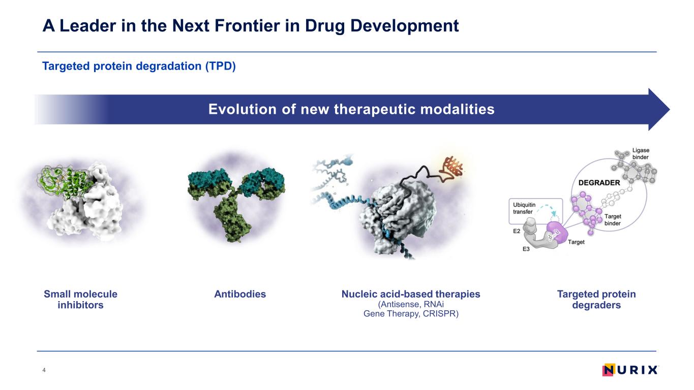 Nurix Is Advancing a Pipeline of Proprietary and Partnered Programs in Oncology and Inflammation & Immunology 3 Program Target Modality Therapeutic area Discovery IND-Enabling Phase 1A Phase 1B/2 Pivotal Bexobrutideg (NX-5948) BTK Degrader B-cell malignancies Zelebrudomide (NX-2127) BTK-IKZF Degrader B-cell malignancies NX-1607 CBL-B Inhibitor of degradation Immuno-oncology BRAF degrader Pan-mutant BRAF Degrader Solid tumors Multiple Undisclosed Degrader Undisclosed Multiple Undisclosed Degrader Undisclosed Multiple Undisclosed DAC Undisclosed Program Target Modality Therapeutic area Discovery IND-Enabling Phase 1A Phase 1B Phase 2/3 Bexobrutideg (NX-5948) BTK Degrader Autoimmune cytopenia in CLL patients NX-0479 / GS-6791 IRAK4 Degrader Rheumatoid arthritis and other inflammatory diseases NX-3911 STAT6 Degrader Type 2 inflammatory diseases Undisclosed Undisclosed Degrader Inflammation / autoimmune Multiple Undisclosed DAC Inflammation / autoimmune O nc ol og y In fla m m at io n & Im m un ol og y