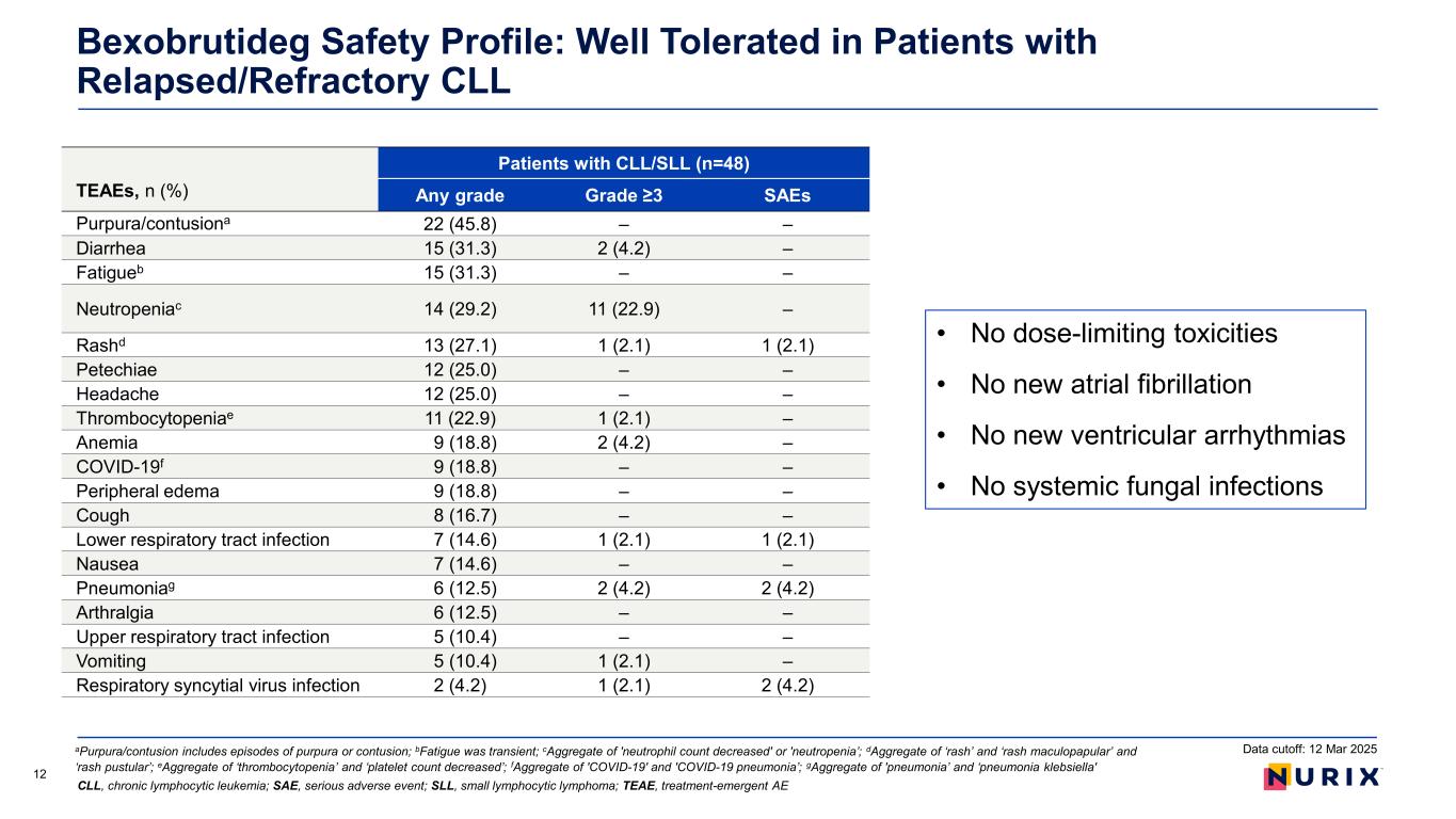 Bexobrutideg Safety Profile: Well Tolerated in Patients with Relapsed/Refractory CLL 12 TEAEs, n (%) Patients with CLL/SLL (n=48) Any grade Grade ≥3 SAEs Purpura/contusiona 22 (45.8) – – Diarrhea 15 (31.3) 2 (4.2) – Fatigueb 15 (31.3) – – Neutropeniac 14 (29.2) 11 (22.9) – Rashd 13 (27.1) 1 (2.1) 1 (2.1) Petechiae 12 (25.0) – – Headache 12 (25.0) – – Thrombocytopeniae 11 (22.9) 1 (2.1) – Anemia 9 (18.8) 2 (4.2) – COVID-19f 9 (18.8) – – Peripheral edema 9 (18.8) – – Cough 8 (16.7) – – Lower respiratory tract infection 7 (14.6) 1 (2.1) 1 (2.1) Nausea 7 (14.6) – – Pneumoniag 6 (12.5) 2 (4.2) 2 (4.2) Arthralgia 6 (12.5) – – Upper respiratory tract infection 5 (10.4) – – Vomiting 5 (10.4) 1 (2.1) – Respiratory syncytial virus infection 2 (4.2) 1 (2.1) 2 (4.2) aPurpura/contusion includes episodes of purpura or contusion; bFatigue was transient; cAggregate of 'neutrophil count decreased' or 'neutropenia’; dAggregate of ‘rash’ and ‘rash maculopapular’ and ‘rash pustular’; eAggregate of ‘thrombocytopenia’ and ‘platelet count decreased’; fAggregate of 'COVID-19' and 'COVID-19 pneumonia’; gAggregate of 'pneumonia’ and ‘pneumonia klebsiella' CLL, chronic lymphocytic leukemia; SAE, serious adverse event; SLL, small lymphocytic lymphoma; TEAE, treatment-emergent AE Data cutoff: 12 Mar 2025 • No dose-limiting toxicities • No new atrial fibrillation • No new ventricular arrhythmias • No systemic fungal infections