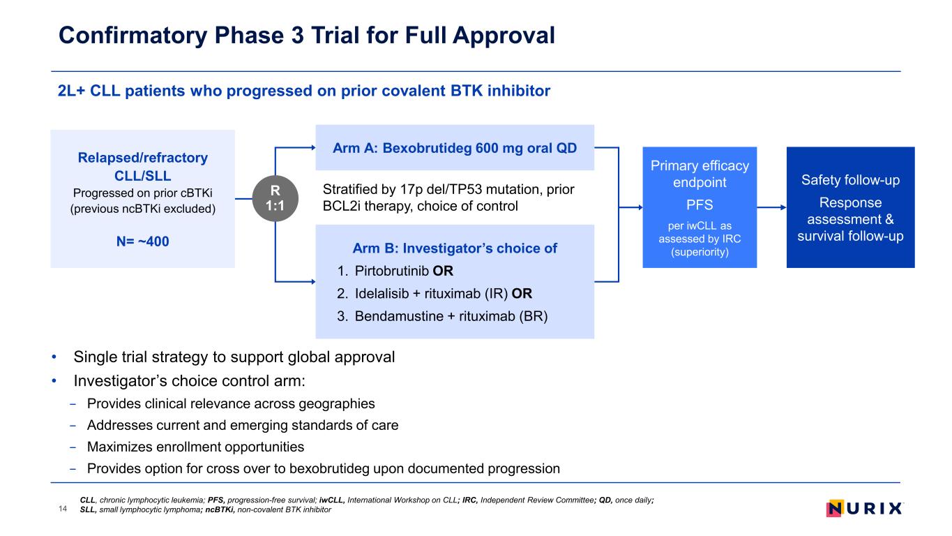 • Accelerated approval strategy depends on: − FDA’s determination of unmet need at time of regulatory review − Adequate enrollment in confirmatory Phase 3 trial • Trial designed to support potential accelerated approval in a high unmet need treatment setting − Post-cBTKi, post-ncBTKi, and post-BCL-2i (triple exposed) • First site activated October 2025 – 600 mg cleared for initiation of pivotal studies Phase 2 Single-Arm Study for Potential Accelerated Approval 13 Primary efficacy endpoint ORR per iwCLL as assessed by IRC Relapsed/refractory CLL/SLL Triple-exposed (post-cBTKi, ncBTKi & BCL-2i) N= ~100 Bexobrutideg orally 600mg QD Response assessment every 8 weeks Safety follow-up Response assessment & survival follow-up CLL, chronic lymphocytic leukemia; ORR, objective response rate; iwCLL, International Workshop on CLL; IRC, Independent Review Committee; QD, once daily; SLL, small lymphocytic lymphoma; cBTKi, covalent BTK inhibitor; ncBTKi, non-covalent BTK inhibitor; BCL-2i, BCL-2 inhibitor Triple-exposed CLL patients who progressed on or did not respond to prior therapy