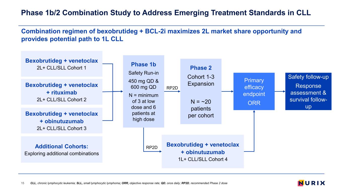 • Single trial strategy to support global approval • Investigator’s choice control arm: − Provides clinical relevance across geographies − Addresses current and emerging standards of care − Maximizes enrollment opportunities − Provides option for cross over to bexobrutideg upon documented progression 2L+ CLL patients who progressed on prior covalent BTK inhibitor Confirmatory Phase 3 Trial for Full Approval 14 Stratified by 17p del/TP53 mutation, prior BCL2i therapy, choice of control Primary efficacy endpoint PFS per iwCLL as assessed by IRC (superiority) Relapsed/refractory CLL/SLL Progressed on prior cBTKi (previous ncBTKi excluded) N= ~400 R 1:1 Arm A: Bexobrutideg 600 mg oral QD Arm B: Investigator’s choice of 1. Pirtobrutinib OR 2. Idelalisib + rituximab (IR) OR 3. Bendamustine + rituximab (BR) Safety follow-up Response assessment & survival follow-up CLL, chronic lymphocytic leukemia; PFS, progression-free survival; iwCLL, International Workshop on CLL; IRC, Independent Review Committee; QD, once daily; SLL, small lymphocytic lymphoma; ncBTKi, non-covalent BTK inhibitor
