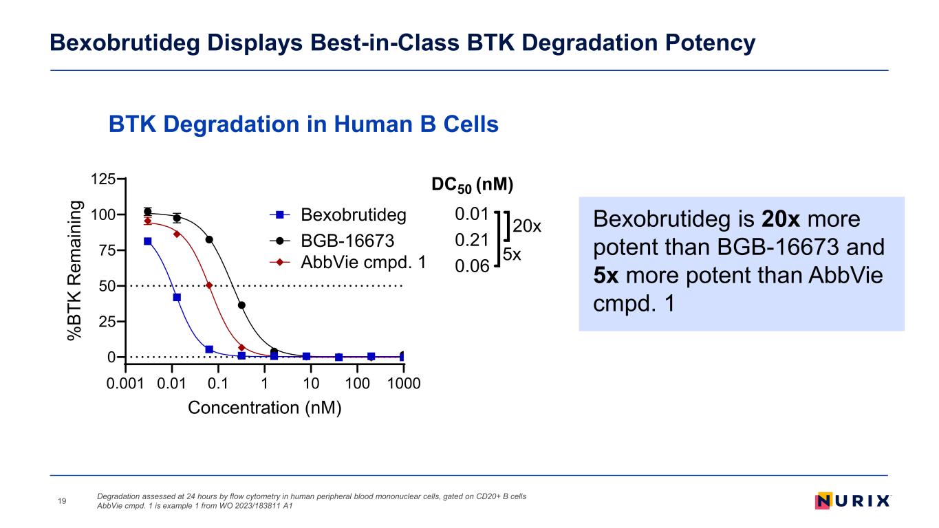 Bexobrutideg Displays Best-in-Class BTK Degradation Potency Degradation assessed at 24 hours by flow cytometry in human peripheral blood mononuclear cells, gated on CD20+ B cells AbbVie cmpd. 1 is example 1 from WO 2023/183811 A119 Bexobrutideg is 20x more potent than BGB-16673 and 5x more potent than AbbVie cmpd. 1 0.001 0.01 0.1 1 10 100 1000 0 25 50 75 100 125 Concentration (nM) % BT K R em ai ni ng Bexobrutideg AbbVie cmpd. 1 BGB-16673 DC50 (nM) 0.01 0.21 0.06 20x 5x BTK Degradation in Human B Cells