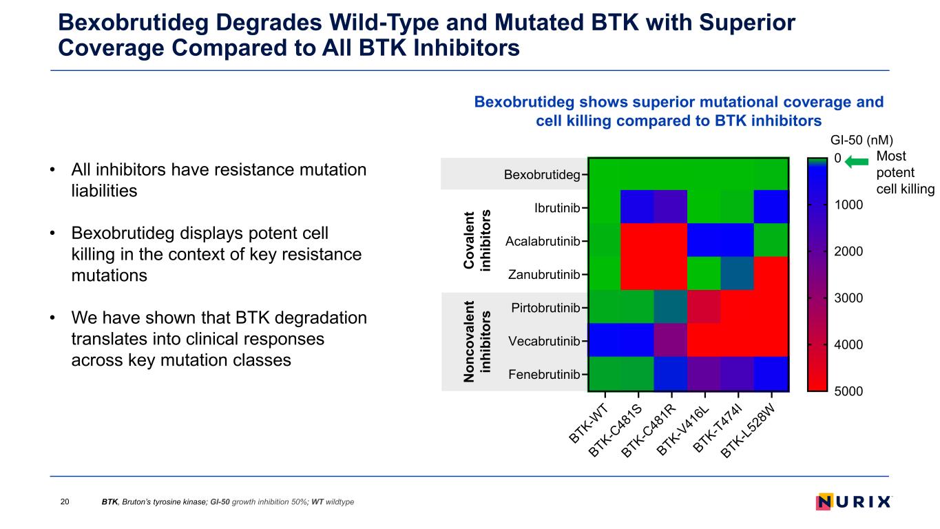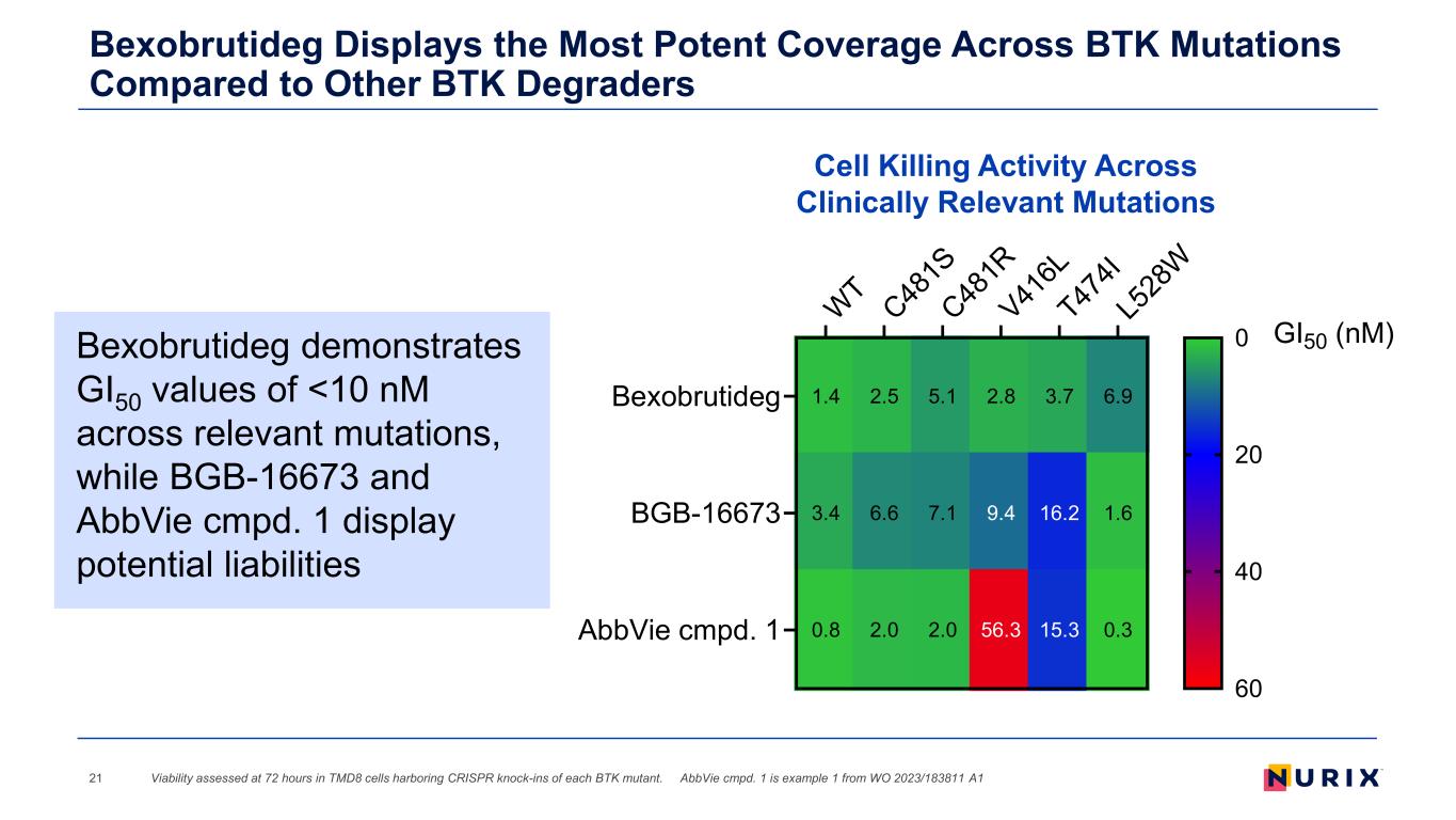 Bexobrutideg Degrades Wild-Type and Mutated BTK with Superior Coverage Compared to All BTK Inhibitors BTK, Bruton’s tyrosine kinase; GI-50 growth inhibition 50%; WT wildtype20 Bexobrutideg shows superior mutational coverage and cell killing compared to BTK inhibitors Most potent cell killing N on co va le nt in hi bi to rs C ov al en t in hi bi to rs • All inhibitors have resistance mutation liabilities • Bexobrutideg displays potent cell killing in the context of key resistance mutations • We have shown that BTK degradation translates into clinical responses across key mutation classes BTK-W T BTK-C 48 1S BTK-C 48 1R BTK-V 41 6L BTK-T47 4I BTK-L5 28 W Bexobrutideg Ibrutinib Acalabrutinib Zanubrutinib Pirtobrutinib Vecabrutinib Fenebrutinib GI-50 (nM) 0 1000 2000 3000 4000 5000