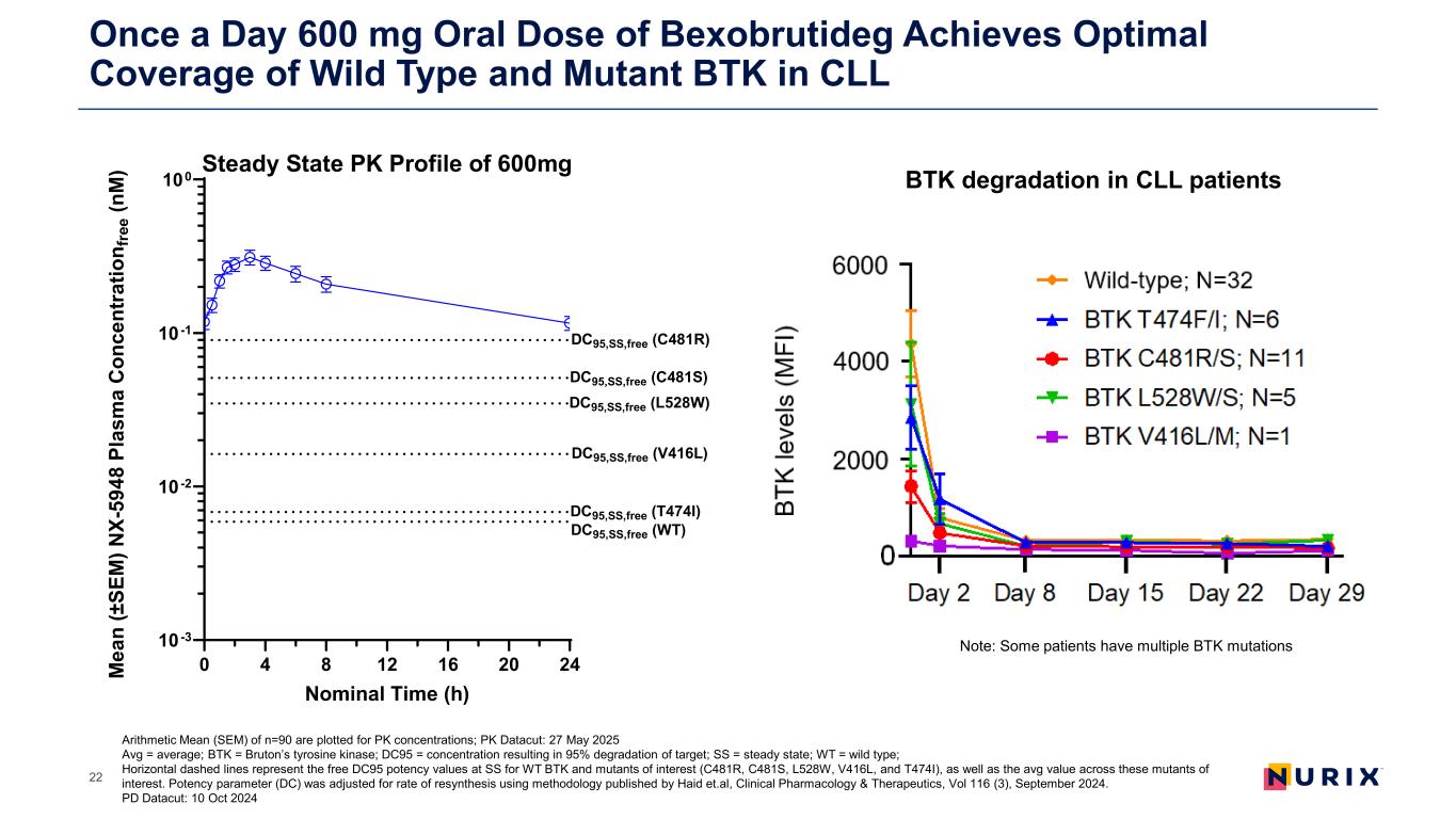 Once a Day 600 mg Oral Dose of Bexobrutideg Achieves Optimal Coverage of Wild Type and Mutant BTK in CLL 22 Note: Some patients have multiple BTK mutations BTK degradation in CLL patients Arithmetic Mean (SEM) of n=90 are plotted for PK concentrations; PK Datacut: 27 May 2025 Avg = average; BTK = Bruton’s tyrosine kinase; DC95 = concentration resulting in 95% degradation of target; SS = steady state; WT = wild type; Horizontal dashed lines represent the free DC95 potency values at SS for WT BTK and mutants of interest (C481R, C481S, L528W, V416L, and T474I), as well as the avg value across these mutants of interest. Potency parameter (DC) was adjusted for rate of resynthesis using methodology published by Haid et.al, Clinical Pharmacology & Therapeutics, Vol 116 (3), September 2024. PD Datacut: 10 Oct 2024 0 4 8 12 16 20 24 10-3 10-2 10-1 100 Steady State PK Profile of 600mg Nominal Time (h) M ea n (± SE M ) N X- 59 48 P la sm a C on ce nt ra tio n f re e ( nM ) DC95,SS,free (WT) DC95,SS,free (C481R) DC95,SS,free (C481S) DC95,SS,free (V416L) DC95,SS,free (T474I) DC95,SS,free (L528W)