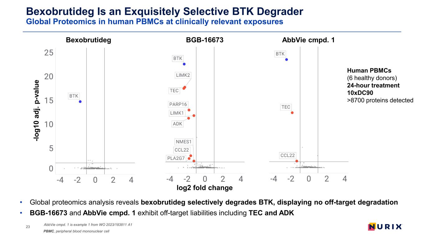 Bexobrutideg Is an Exquisitely Selective BTK Degrader Global Proteomics in human PBMCs at clinically relevant exposures • Global proteomics analysis reveals bexobrutideg selectively degrades BTK, displaying no off-target degradation • BGB-16673 and AbbVie cmpd. 1 exhibit off-target liabilities including TEC and ADK 23 -lo g1 0 ad j. p- va lu e log2 fold change Bexobrutideg AbbVie cmpd. 1BGB-16673 Human PBMCs (6 healthy donors) 24-hour treatment 10xDC90 >8700 proteins detected AbbVie cmpd. 1 is example 1 from WO 2023/183811 A1 PBMC, peripheral blood mononuclear cell