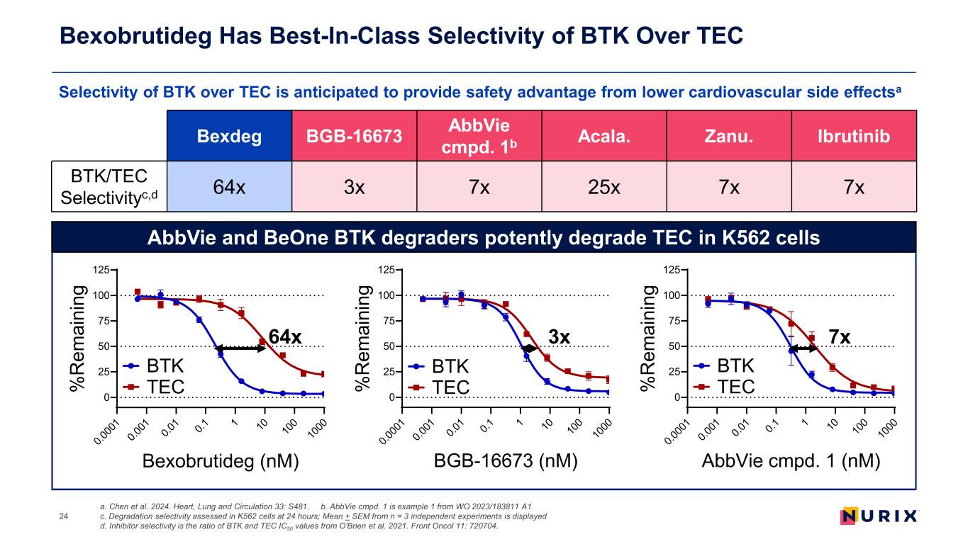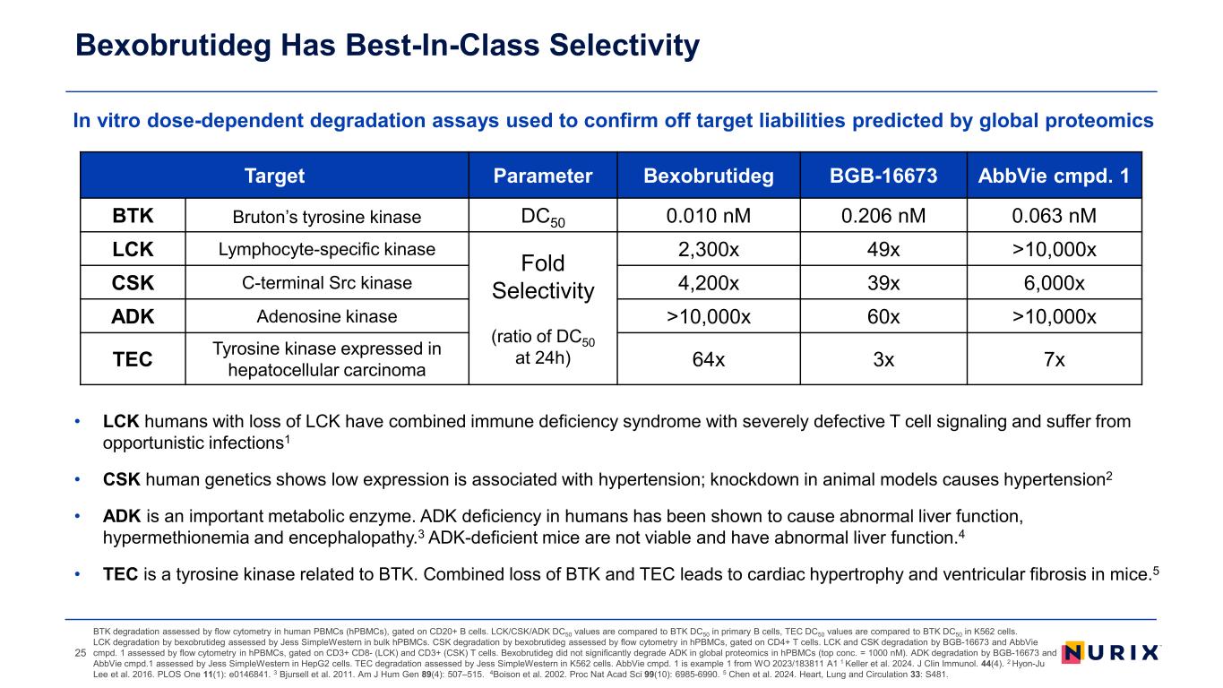 Bexdeg BGB-16673 AbbVie cmpd. 1b Acala. Zanu. Ibrutinib BTK/TEC Selectivityc,d 64x 3x 7x 25x 7x 7x 0.0 00 1 0.0 01 0.0 1 0.1 1 10 10 0 10 00 0 25 50 75 100 125 Bexobrutideg (nM) % R em ai ni ng BTK TEC 0.0 00 1 0.0 01 0.0 1 0.1 1 10 10 0 10 00 0 25 50 75 100 125 BGB-16673 (nM) % R em ai ni ng BTK TEC 0.0 00 1 0.0 01 0.0 1 0.1 1 10 10 0 10 00 0 25 50 75 100 125 AbbVie cmpd. 1 (nM) % R em ai ni ng BTK TEC Selectivity of BTK over TEC is anticipated to provide safety advantage from lower cardiovascular side effectsa Bexobrutideg Has Best-In-Class Selectivity of BTK Over TEC a. Chen et al. 2024. Heart, Lung and Circulation 33: S481. b. AbbVie cmpd. 1 is example 1 from WO 2023/183811 A1 c. Degradation selectivity assessed in K562 cells at 24 hours; Mean + SEM from n = 3 independent experiments is displayed d. Inhibitor selectivity is the ratio of BTK and TEC IC50 values from O’Brien et al. 2021. Front Oncol 11: 720704. 24 64x 3x 7x AbbVie and BeOne BTK degraders potently degrade TEC in K562 cells
