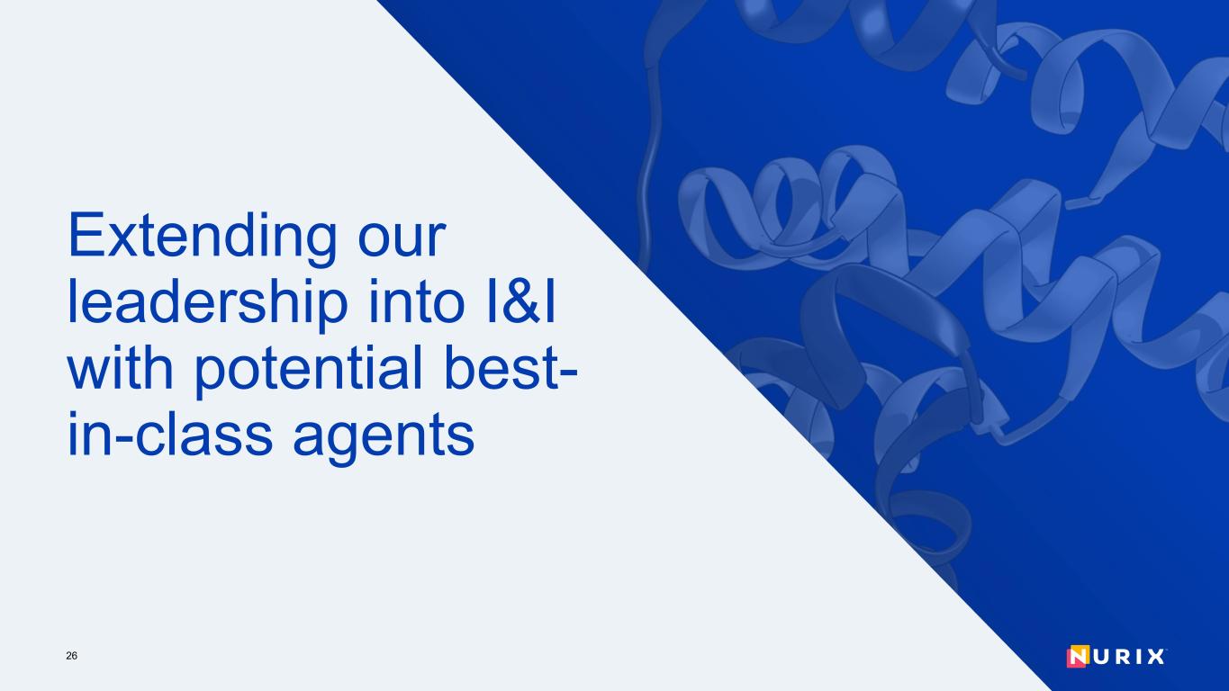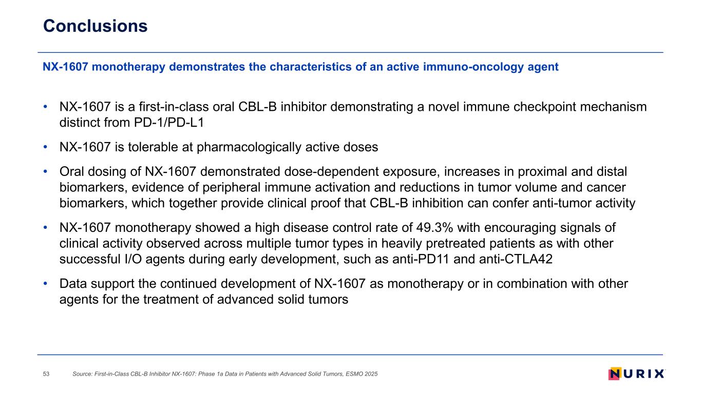 • NX-1607 is a first-in-class oral CBL-B inhibitor demonstrating a novel immune checkpoint mechanism distinct from PD-1/PD-L1 • NX-1607 is tolerable at pharmacologically active doses • Oral dosing of NX-1607 demonstrated dose-dependent exposure, increases in proximal and distal biomarkers, evidence of peripheral immune activation and reductions in tumor volume and cancer biomarkers, which together provide clinical proof that CBL-B inhibition can confer anti-tumor activity • NX-1607 monotherapy showed a high disease control rate of 49.3% with encouraging signals of clinical activity observed across multiple tumor types in heavily pretreated patients as with other successful I/O agents during early development, such as anti-PD11 and anti-CTLA42 • Data support the continued development of NX-1607 as monotherapy or in combination with other agents for the treatment of advanced solid tumors NX-1607 monotherapy demonstrates the characteristics of an active immuno-oncology agent Conclusions Source: First-in-Class CBL-B Inhibitor NX-1607: Phase 1a Data in Patients with Advanced Solid Tumors, ESMO 202553