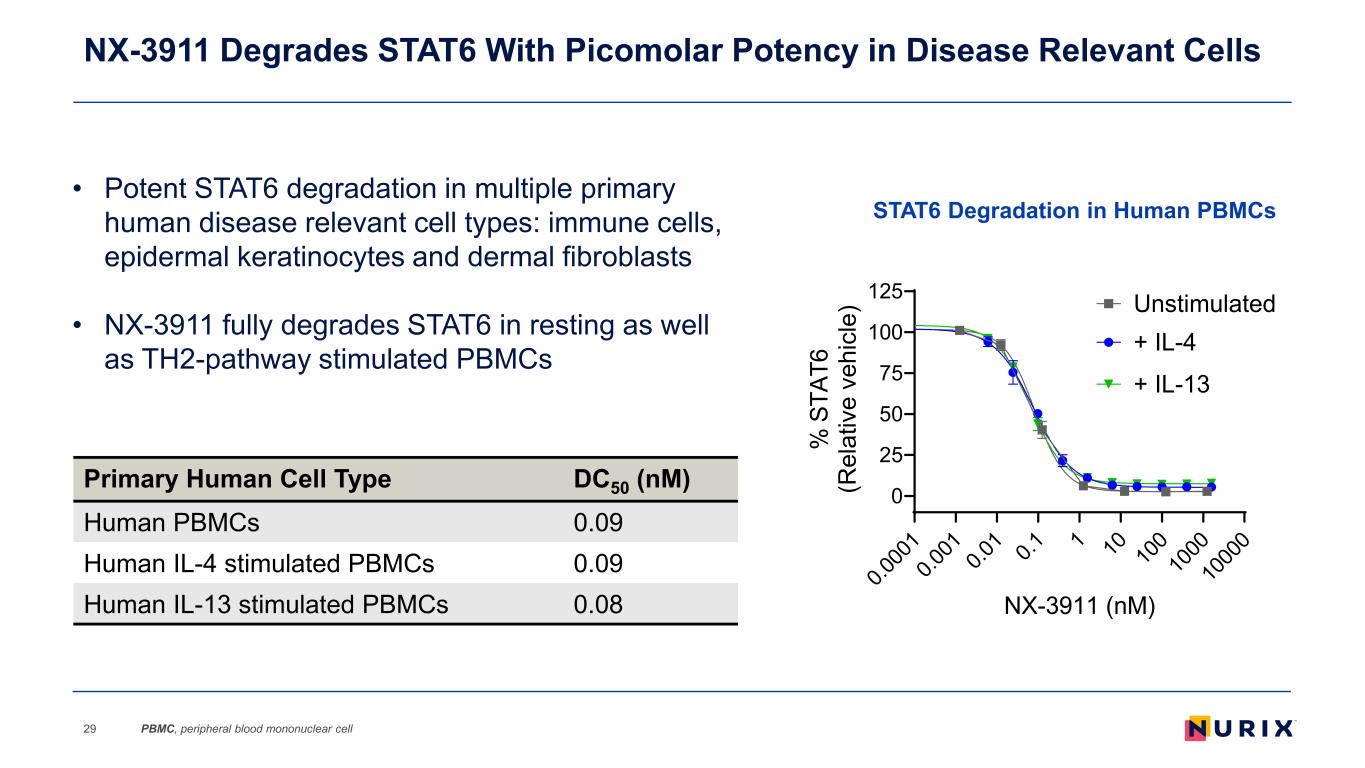NX-3911: A Potential Best-in-Class STAT6 Degrader in Collaboration with Sanofi that Achieves Complete STAT6 Pathway Blockade 28 The STAT6 Transcription Factor: Acts as a key regulator of the JAK/STAT signaling pathway selectively downstream of the inflammatory cytokines IL-4 and IL-13 Drives Th2-mediated inflammatory disorders including allergies, asthma, atopic dermatitis, and eosinophilic esophagitis Pathway is clinically validated: • anti-IL4Ra and anti-IL13 monoclonal antibodies • JAK inhibitors NX-3911 Potential for Biologic-like Efficacy in a Pill NX-3911 IL-4 IL-4/IL-13 DEGRADED STAT6 / pSTAT6 P P STAT6 Tyk2 JAK3 JAK1 JAK1 STAT6 STAT6 plays a central role in type 2 inflammation, driving diseases such as atopic dermatitis & asthma Allergy and type 2 inflammation disrupted KEY ADVANTAGES: Powerful efficacy: Delivers complete STAT6 pathway blockade in disease- relevant cells Exquisite selectivity: Designed to avoid off target effects Patient-friendly: Convenient oral dosing Greater accessibility: Potentially expands treatment to previously unreachable populations JAK, Janus kinase; STAT, Signal Transducer and Activator of Transcription