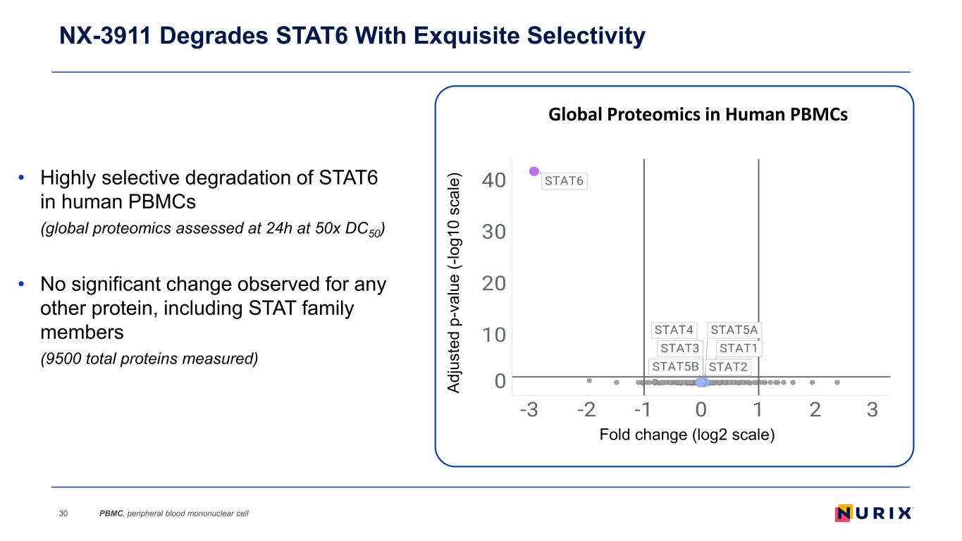NX-3911 Degrades STAT6 With Picomolar Potency in Disease Relevant Cells 29 Primary Human Cell Type DC50 (nM) Human PBMCs 0.09 Human IL-4 stimulated PBMCs 0.09 Human IL-13 stimulated PBMCs 0.08 • Potent STAT6 degradation in multiple primary human disease relevant cell types: immune cells, epidermal keratinocytes and dermal fibroblasts • NX-3911 fully degrades STAT6 in resting as well as TH2-pathway stimulated PBMCs 0.0 00 1 0.0 01 0.0 1 0.1 1 10 10 0 10 00 10 00 0 0 25 50 75 100 125 NX-3911 (nM) % S TA T6 (R el at iv e ve hi cl e) + IL-4 + IL-13 Unstimulated STAT6 Degradation in Human PBMCs PBMC, peripheral blood mononuclear cell