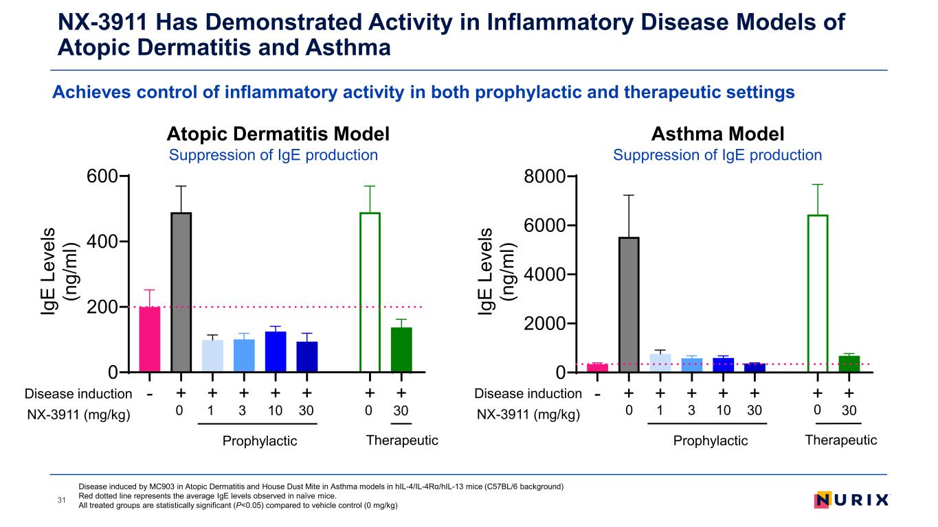 NX-3911 Has Demonstrated Activity in Inflammatory Disease Models of Atopic Dermatitis and Asthma 31 - + + + + + + + 0 200 400 600 Ig E Le ve ls (n g/ m l) - + + + + + + + 0 2000 4000 6000 8000 Ig E Le ve ls (n g/ m l) Asthma Model Suppression of IgE production Atopic Dermatitis Model Suppression of IgE production Disease induced by MC903 in Atopic Dermatitis and House Dust Mite in Asthma models in hIL-4/IL-4Rα/hIL-13 mice (C57BL/6 background) Red dotted line represents the average IgE levels observed in naïve mice. All treated groups are statistically significant (P<0.05) compared to vehicle control (0 mg/kg) Prophylactic Disease induction NX-3911 (mg/kg) Therapeutic 1 3 10 30 300 0 Prophylactic Disease induction NX-3911 (mg/kg) Therapeutic 1 3 10 30 300 0 Achieves control of inflammatory activity in both prophylactic and therapeutic settings
