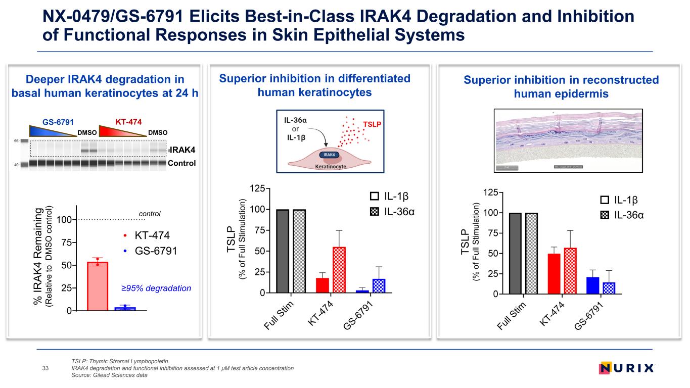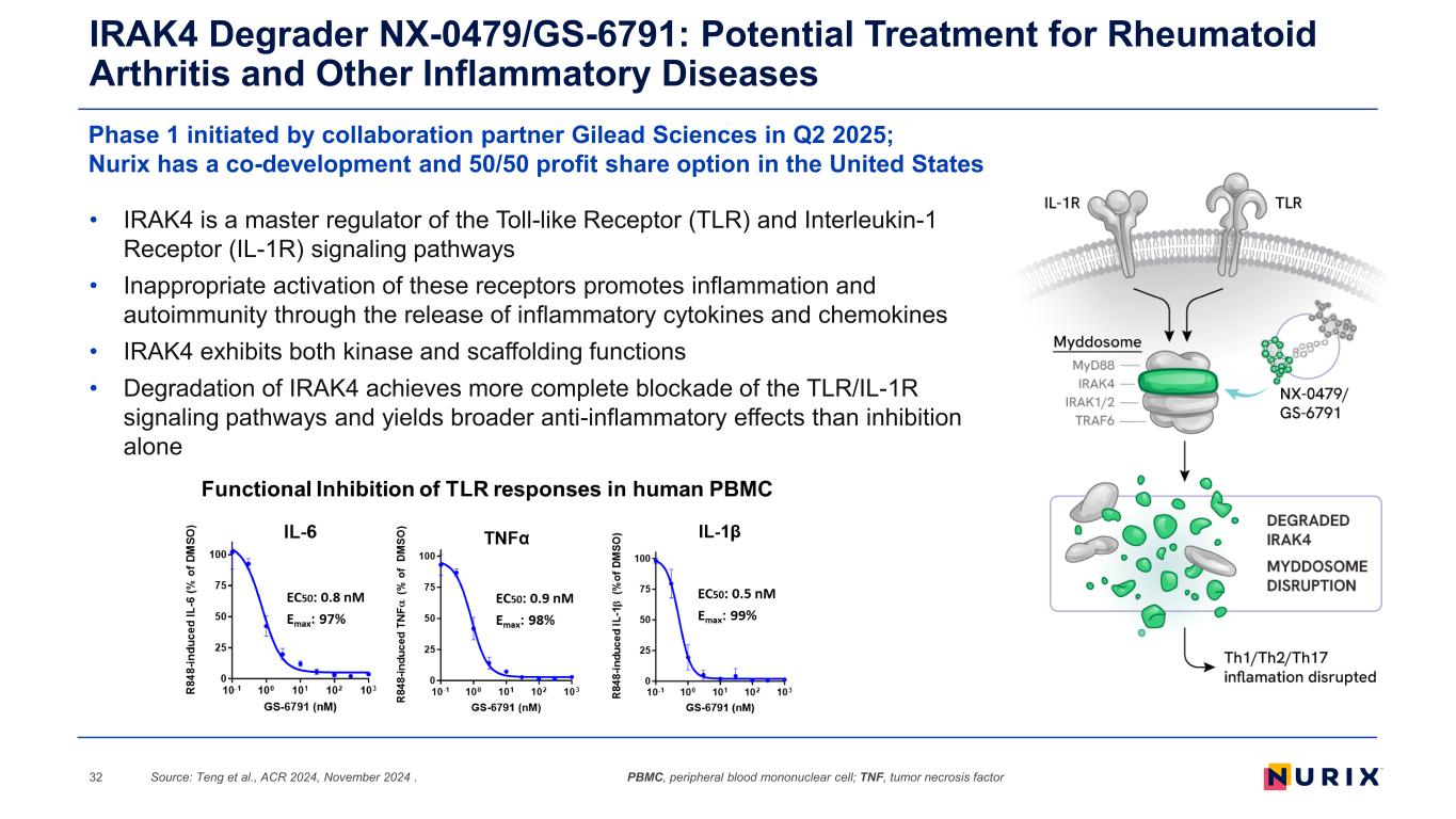 IRAK4 Degrader NX-0479/GS-6791: Potential Treatment for Rheumatoid Arthritis and Other Inflammatory Diseases Source: Teng et al., ACR 2024, November 2024 .32 Phase 1 initiated by collaboration partner Gilead Sciences in Q2 2025; Nurix has a co-development and 50/50 profit share option in the United States • IRAK4 is a master regulator of the Toll-like Receptor (TLR) and Interleukin-1 Receptor (IL-1R) signaling pathways • Inappropriate activation of these receptors promotes inflammation and autoimmunity through the release of inflammatory cytokines and chemokines • IRAK4 exhibits both kinase and scaffolding functions • Degradation of IRAK4 achieves more complete blockade of the TLR/IL-1R signaling pathways and yields broader anti-inflammatory effects than inhibition alone PBMC, peripheral blood mononuclear cell; TNF, tumor necrosis factor