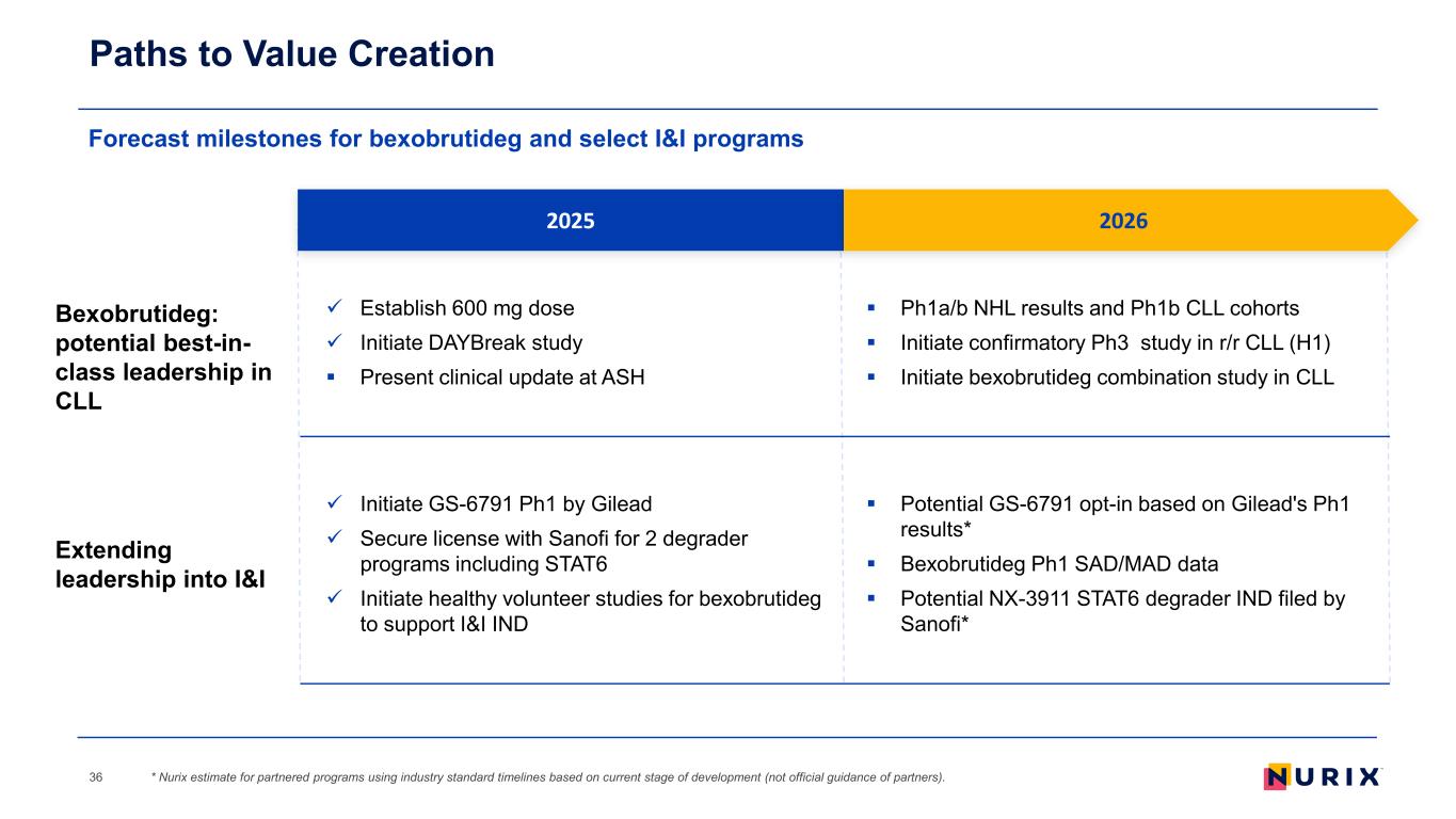 • Bexobrutideg has the potential to produce a pipeline of value over the course of its lifecycle • CLL, WM, NHL, and potentially I&I indications • Advancing bexobrutideg one step closer to registration and commercialization 600 mg dose selected per Project Optimus Regulatory alignment on dose with FDA, MHRA, EMA Pivotal Phase 2 trial initiated – DAYBreak CLL-201 Confirmatory Phase 3 trial initiation planned for H1 2026 • Potential best-in-class profile emerging for bexobrutideg • Partnered programs advancing toward significant regulatory and clinical milestones and have the potential to create substantial value for Nurix shareholders with our 50-50 U.S. profit share opt in rights • STAT6 and IRAK4 • Upon completion of our registered direct offering, pro forma cash is anticipated to be $678.8 million, providing expected runway into 2028* Building an Oncology and Immunology Powerhouse 35 EMA, European Medicines Agency; FDA, U.S. Food and Drug Administration; MHRA, U.K. Medicines and Healthcare products Regulatory Agency * Pro forma cash reflects expected net proceeds from the October 2025 offering added to Nurix’s cash, cash equivalents, and marketable securities balance as of August 31, 2025.