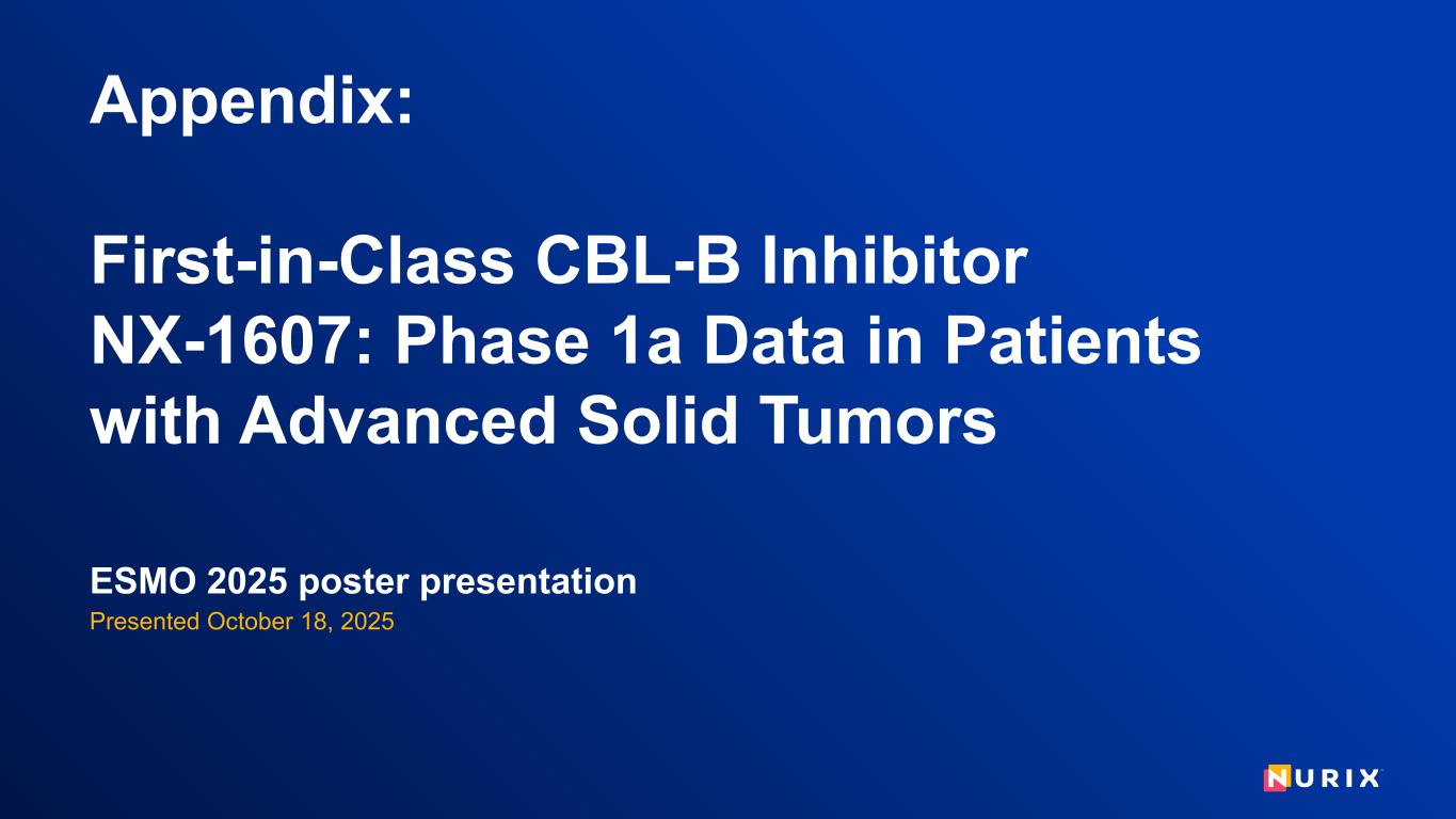 ESMO 2025 poster presentation Presented October 18, 2025 Appendix: First-in-Class CBL-B Inhibitor NX-1607: Phase 1a Data in Patients with Advanced Solid Tumors