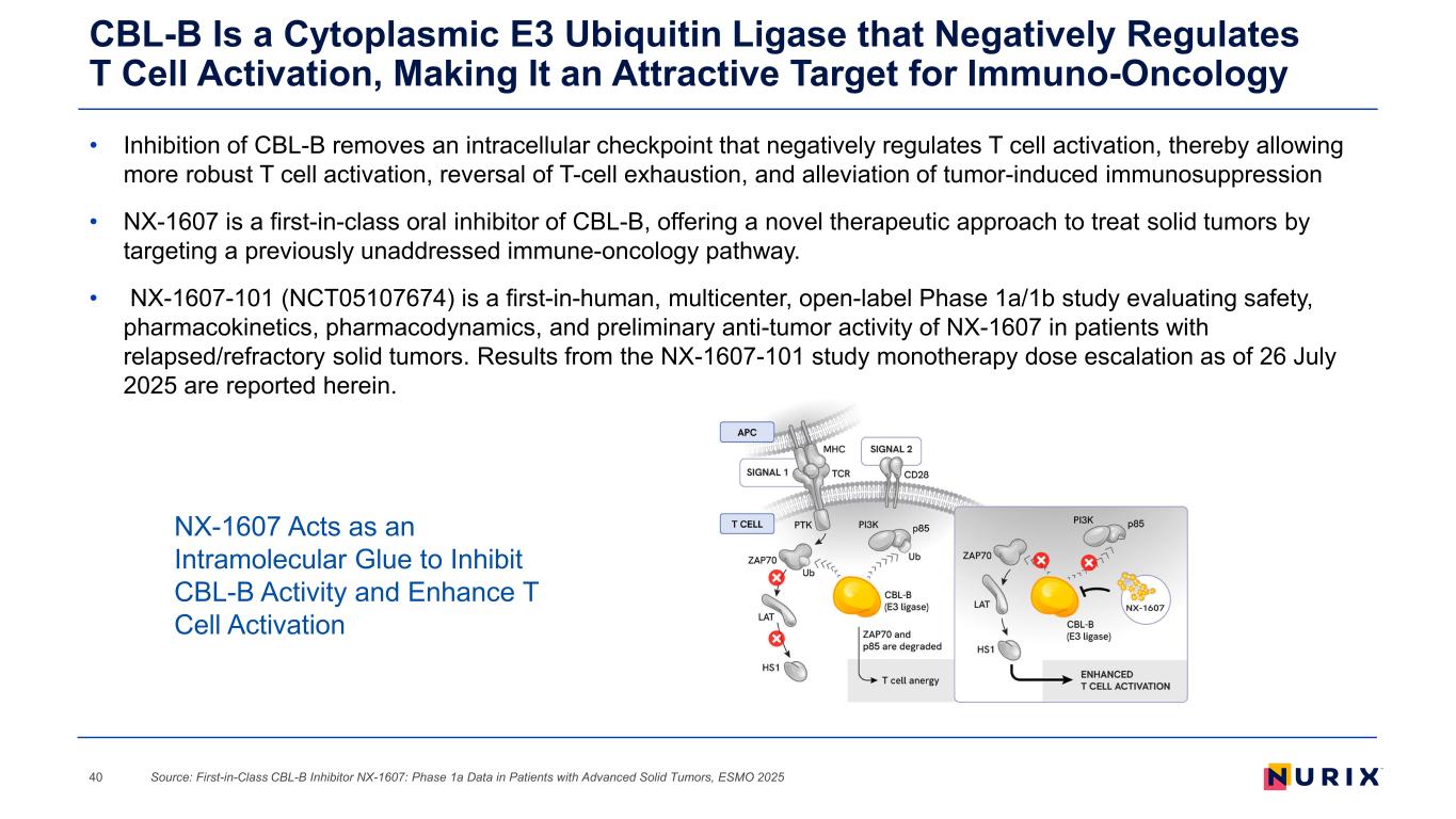 • Inhibition of CBL-B removes an intracellular checkpoint that negatively regulates T cell activation, thereby allowing more robust T cell activation, reversal of T-cell exhaustion, and alleviation of tumor-induced immunosuppression • NX-1607 is a first-in-class oral inhibitor of CBL-B, offering a novel therapeutic approach to treat solid tumors by targeting a previously unaddressed immune-oncology pathway. • NX-1607-101 (NCT05107674) is a first-in-human, multicenter, open-label Phase 1a/1b study evaluating safety, pharmacokinetics, pharmacodynamics, and preliminary anti-tumor activity of NX-1607 in patients with relapsed/refractory solid tumors. Results from the NX-1607-101 study monotherapy dose escalation as of 26 July 2025 are reported herein. CBL-B Is a Cytoplasmic E3 Ubiquitin Ligase that Negatively Regulates T Cell Activation, Making It an Attractive Target for Immuno-Oncology Source: First-in-Class CBL-B Inhibitor NX-1607: Phase 1a Data in Patients with Advanced Solid Tumors, ESMO 202540 NX-1607 Acts as an Intramolecular Glue to Inhibit CBL-B Activity and Enhance T Cell Activation