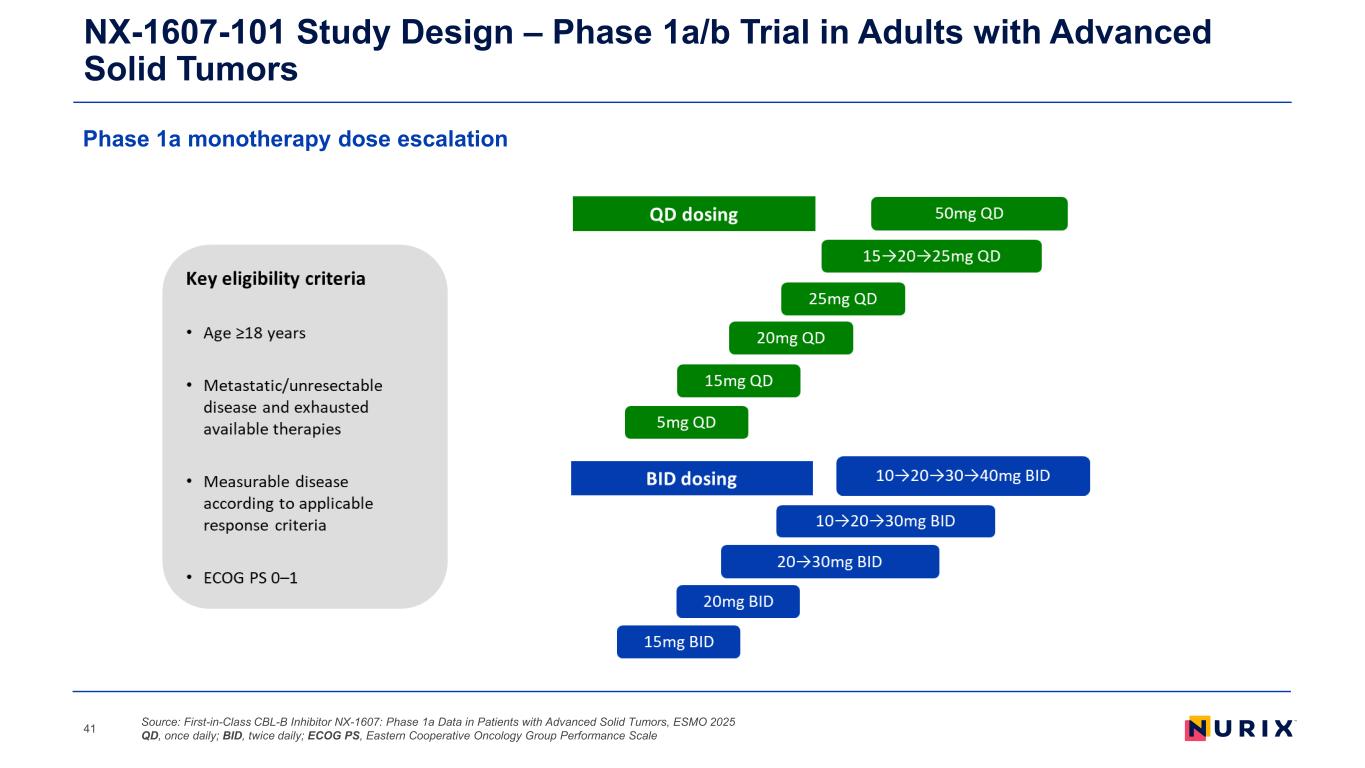Phase 1a monotherapy dose escalation NX-1607-101 Study Design – Phase 1a/b Trial in Adults with Advanced Solid Tumors Source: First-in-Class CBL-B Inhibitor NX-1607: Phase 1a Data in Patients with Advanced Solid Tumors, ESMO 2025 QD, once daily; BID, twice daily; ECOG PS, Eastern Cooperative Oncology Group Performance Scale41