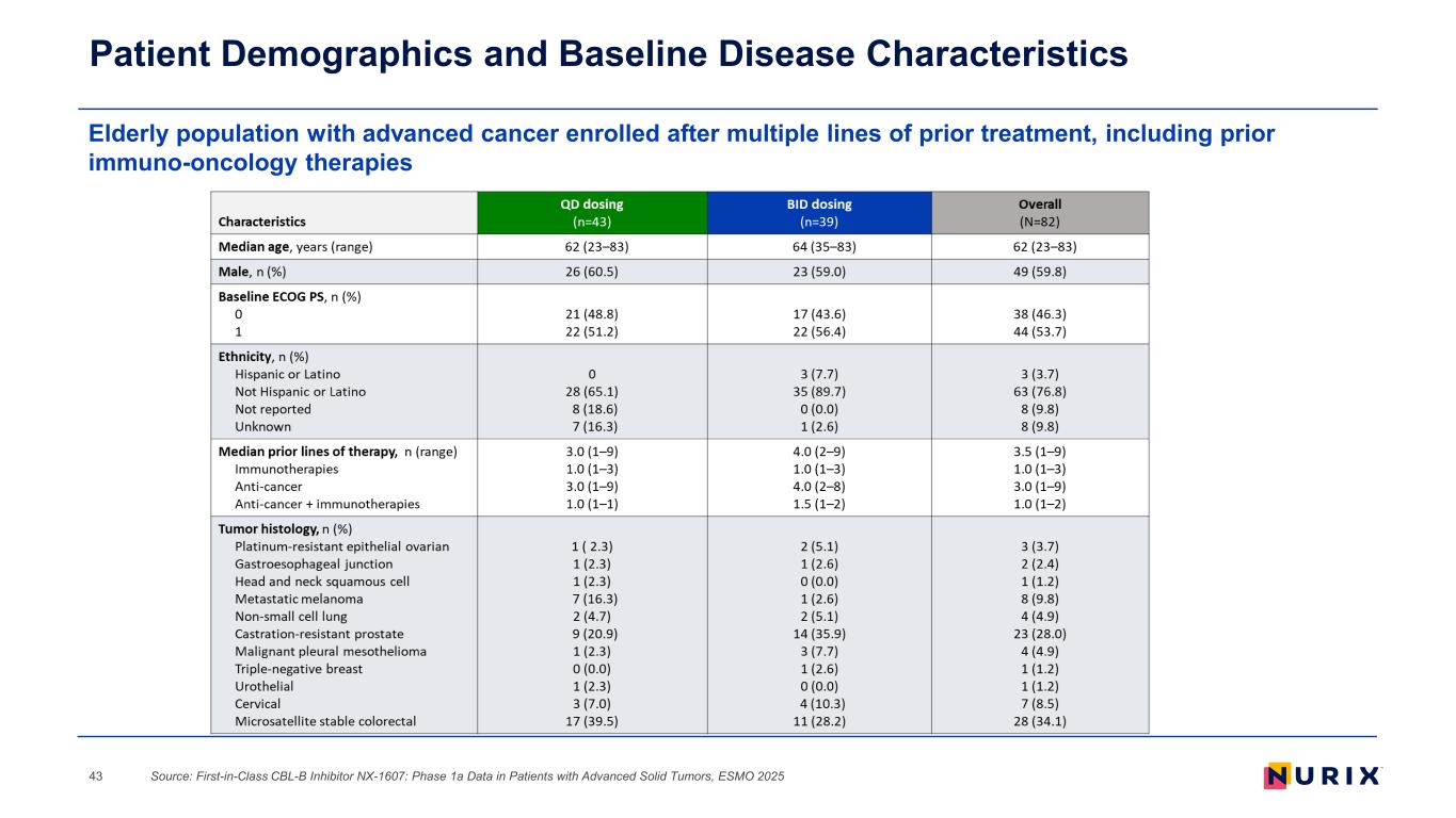 Elderly population with advanced cancer enrolled after multiple lines of prior treatment, including prior immuno-oncology therapies Patient Demographics and Baseline Disease Characteristics Source: First-in-Class CBL-B Inhibitor NX-1607: Phase 1a Data in Patients with Advanced Solid Tumors, ESMO 202543