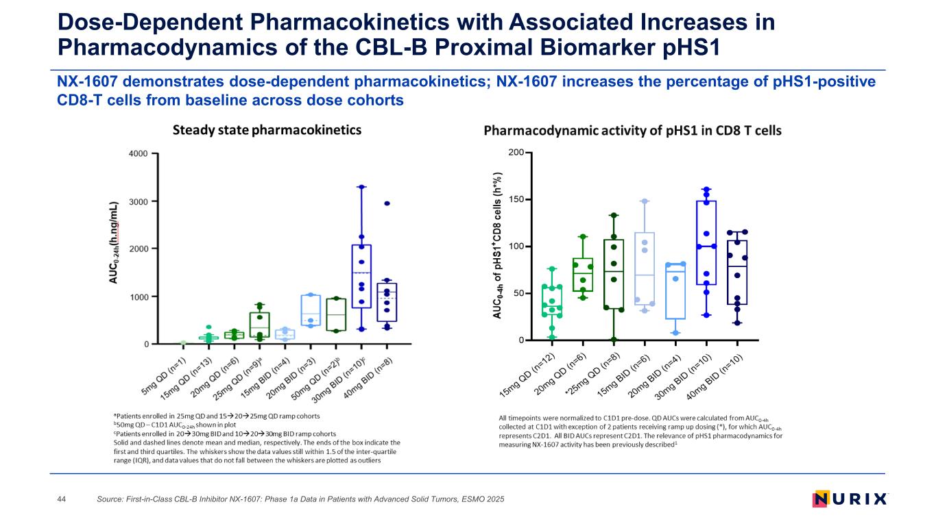 NX-1607 demonstrates dose-dependent pharmacokinetics; NX-1607 increases the percentage of pHS1-positive CD8-T cells from baseline across dose cohorts Dose-Dependent Pharmacokinetics with Associated Increases in Pharmacodynamics of the CBL-B Proximal Biomarker pHS1 Source: First-in-Class CBL-B Inhibitor NX-1607: Phase 1a Data in Patients with Advanced Solid Tumors, ESMO 202544