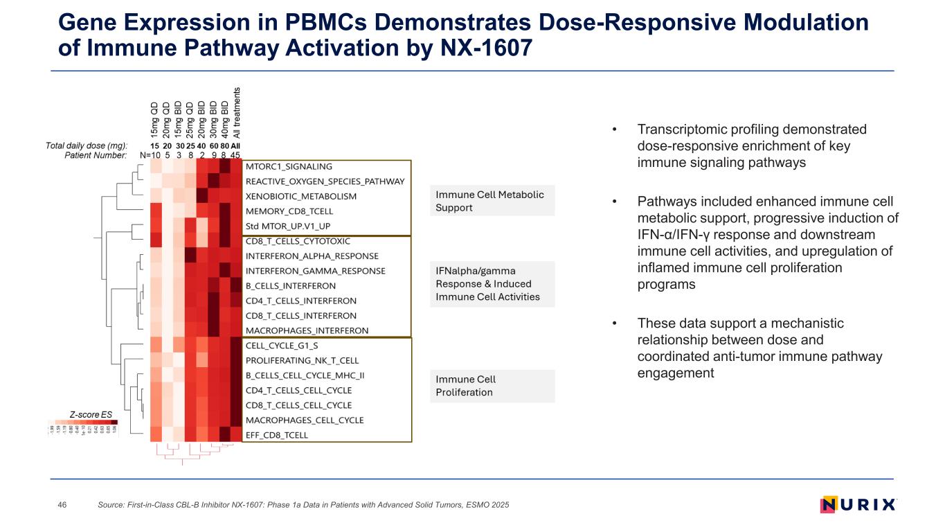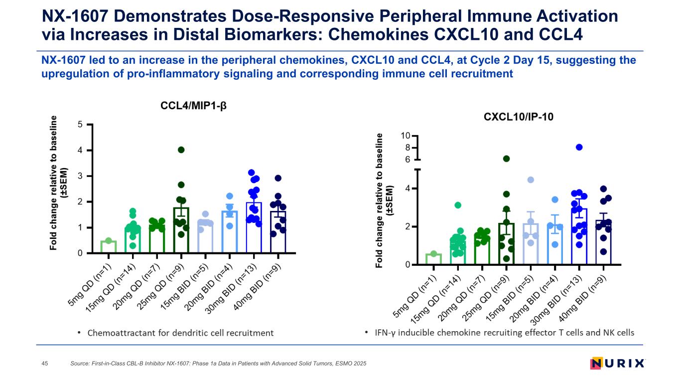 NX-1607 led to an increase in the peripheral chemokines, CXCL10 and CCL4, at Cycle 2 Day 15, suggesting the upregulation of pro-inflammatory signaling and corresponding immune cell recruitment NX-1607 Demonstrates Dose-Responsive Peripheral Immune Activation via Increases in Distal Biomarkers: Chemokines CXCL10 and CCL4 Source: First-in-Class CBL-B Inhibitor NX-1607: Phase 1a Data in Patients with Advanced Solid Tumors, ESMO 202545