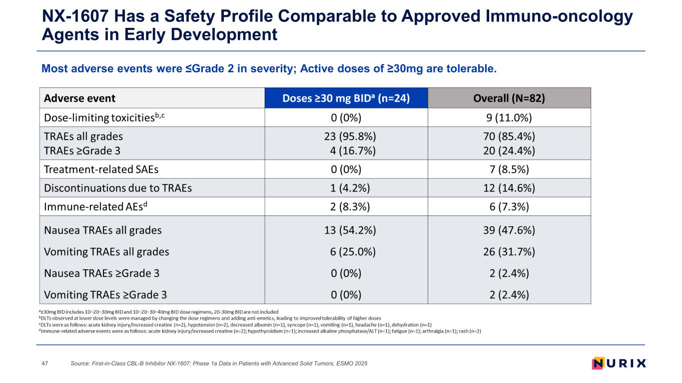 Most adverse events were ≤Grade 2 in severity; Active doses of ≥30mg are tolerable. NX-1607 Has a Safety Profile Comparable to Approved Immuno-oncology Agents in Early Development Source: First-in-Class CBL-B Inhibitor NX-1607: Phase 1a Data in Patients with Advanced Solid Tumors, ESMO 202547