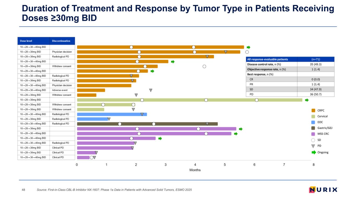 Duration of Treatment and Response by Tumor Type in Patients Receiving Doses ≥30mg BID Source: First-in-Class CBL-B Inhibitor NX-1607: Phase 1a Data in Patients with Advanced Solid Tumors, ESMO 202548