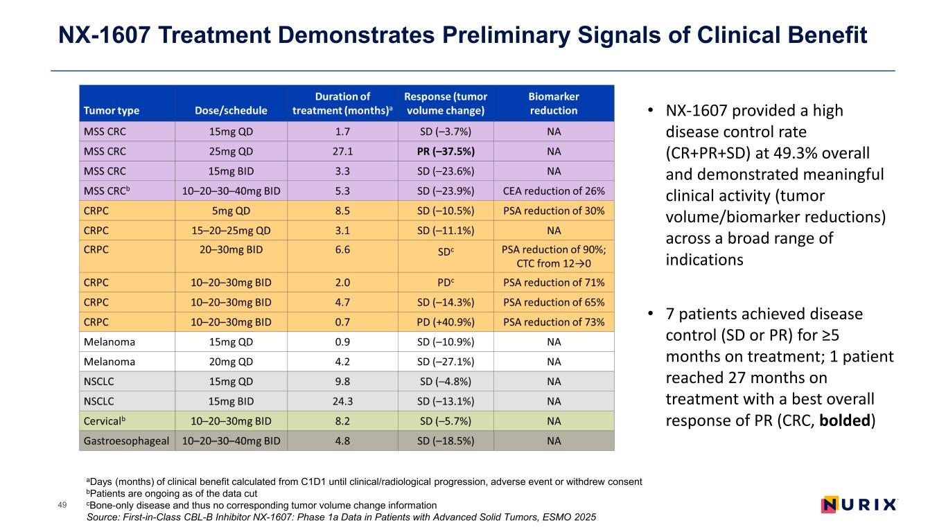 NX-1607 Treatment Demonstrates Preliminary Signals of Clinical Benefit 49 aDays (months) of clinical benefit calculated from C1D1 until clinical/radiological progression, adverse event or withdrew consent bPatients are ongoing as of the data cut cBone-only disease and thus no corresponding tumor volume change information Source: First-in-Class CBL-B Inhibitor NX-1607: Phase 1a Data in Patients with Advanced Solid Tumors, ESMO 2025 • NX-1607 provided a high disease control rate (CR+PR+SD) at 49.3% overall and demonstrated meaningful clinical activity (tumor volume/biomarker reductions) across a broad range of indications • 7 patients achieved disease control (SD or PR) for ≥5 months on treatment; 1 patient reached 27 months on treatment with a best overall response of PR (CRC, bolded)