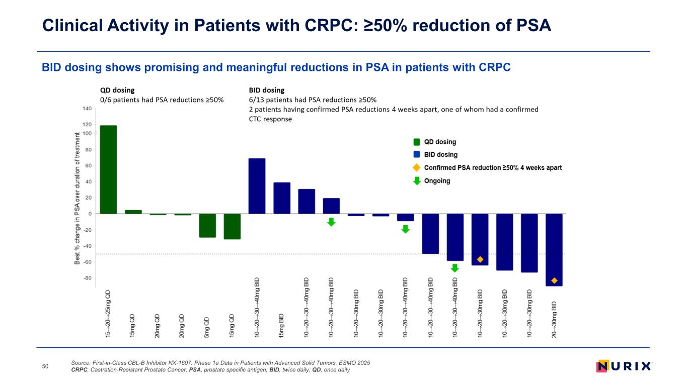 BID dosing shows promising and meaningful reductions in PSA in patients with CRPC Clinical Activity in Patients with CRPC: ≥50% reduction of PSA Source: First-in-Class CBL-B Inhibitor NX-1607: Phase 1a Data in Patients with Advanced Solid Tumors, ESMO 2025 CRPC, Castration-Resistant Prostate Cancer; PSA, prostate specific antigen; BID, twice daily; QD, once daily50