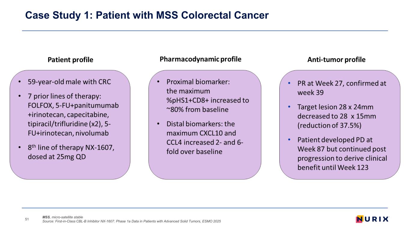 Case Study 1: Patient with MSS Colorectal Cancer MSS, micro-satellite stable Source: First-in-Class CBL-B Inhibitor NX-1607: Phase 1a Data in Patients with Advanced Solid Tumors, ESMO 202551
