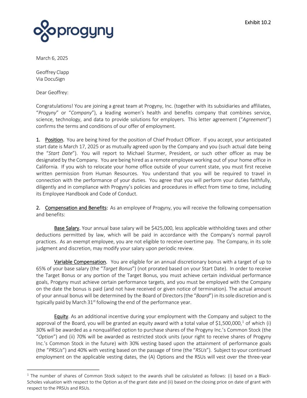 Exhibit 10.2 March 6, 2025 Geoffrey Clapp Via DocuSign Dear Geoffrey: Congratulations! You are joining a great team at Progyny, Inc. (together with its subsidiaries and affiliates, “Progyny” or “Company”), a leading women’s health and benefits company that combines service, science, technology, and data to provide solutions for employers. This letter agreement (“Agreement”) confirms the terms and conditions of our offer of employment. 1. Position. You are being hired for the position of Chief Product Officer. If you accept, your anticipated start date is March 17, 2025 or as mutually agreed upon by the Company and you (such actual date being the “Start Date”). You will report to Michael Sturmer, President, or such other officer as may be designated by the Company. You are being hired as a remote employee working out of your home office in California. If you wish to relocate your home office outside of your current state, you must first receive written permission from Human Resources. You understand that you will be required to travel in connection with the performance of your duties. You agree that you will perform your duties faithfully, diligently and in compliance with Progyny’s policies and procedures in effect from time to time, including its Employee Handbook and Code of Conduct. 2. Compensation and Benefits: As an employee of Progyny, you will receive the following compensation and benefits: Base Salary. Your annual base salary will be $425,000, less applicable withholding taxes and other deductions permitted by law, which will be paid in accordance with the Company’s normal payroll practices. As an exempt employee, you are not eligible to receive overtime pay. The Company, in its sole judgment and discretion, may modify your salary upon periodic review. Variable Compensation. You are eligible for an annual discretionary bonus with a target of up to 65% of your base salary (the “Target Bonus”) (not prorated based on your Start Date). In order to receive the Target Bonus or any portion of the Target Bonus, you must achieve certain individual performance goals, Progyny must achieve certain performance targets, and you must be employed with the Company on the date the bonus is paid (and not have received or given notice of termination). The actual amount of your annual bonus will be determined by the Board of Directors (the “Board”) in its sole discretion and is typically paid by March 31st following the end of the performance year. Equity. As an additional incentive during your employment with the Company and subject to the approval of the Board, you will be granted an equity award with a total value of $1,500,000,1 of which (i) 30% will be awarded as a nonqualified option to purchase shares of the Progyny Inc.’s Common Stock (the “Option”) and (ii) 70% will be awarded as restricted stock units (your right to receive shares of Progyny Inc.’s Common Stock in the future) with 30% vesting based upon the attainment of performance goals (the “PRSUs”) and 40% with vesting based on the passage of time (the “RSUs”). Subject to your continued employment on the applicable vesting dates, the (A) Options and the RSUs will vest over the three-year 1 The number of shares of Common Stock subject to the awards shall be calculated as follows: (i) based on a Black- Scholes valuation with respect to the Option as of the grant date and (ii) based on the closing price on date of grant with respect to the PRSUs and RSUs.