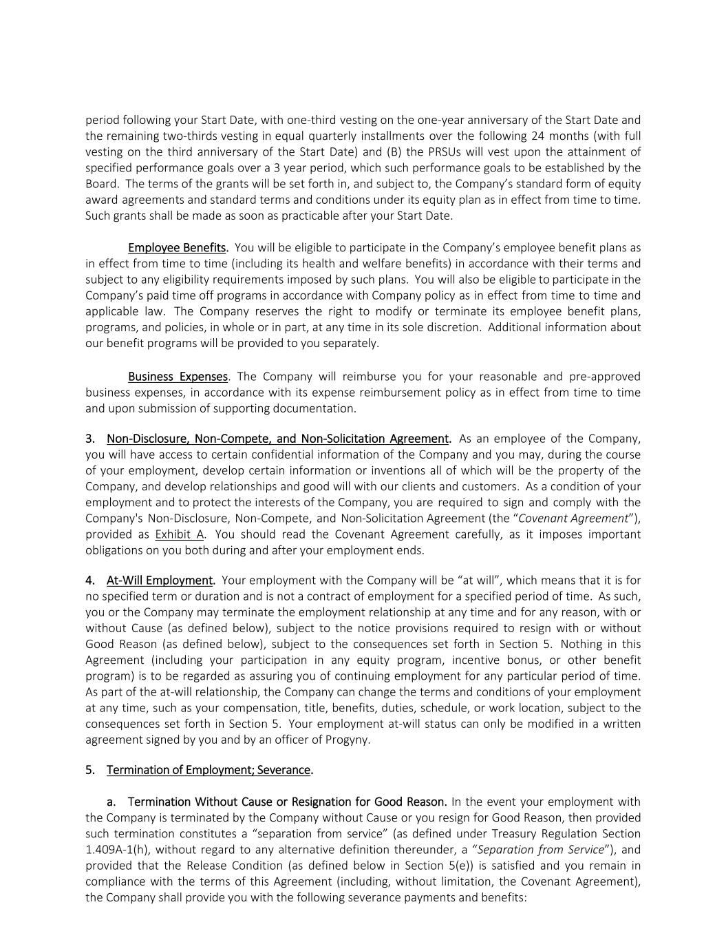 period following your Start Date, with one-third vesting on the one-year anniversary of the Start Date and the remaining two-thirds vesting in equal quarterly installments over the following 24 months (with full vesting on the third anniversary of the Start Date) and (B) the PRSUs will vest upon the attainment of specified performance goals over a 3 year period, which such performance goals to be established by the Board. The terms of the grants will be set forth in, and subject to, the Company’s standard form of equity award agreements and standard terms and conditions under its equity plan as in effect from time to time. Such grants shall be made as soon as practicable after your Start Date. Employee Benefits. You will be eligible to participate in the Company’s employee benefit plans as in effect from time to time (including its health and welfare benefits) in accordance with their terms and subject to any eligibility requirements imposed by such plans. You will also be eligible to participate in the Company’s paid time off programs in accordance with Company policy as in effect from time to time and applicable law. The Company reserves the right to modify or terminate its employee benefit plans, programs, and policies, in whole or in part, at any time in its sole discretion. Additional information about our benefit programs will be provided to you separately. Business Expenses. The Company will reimburse you for your reasonable and pre-approved business expenses, in accordance with its expense reimbursement policy as in effect from time to time and upon submission of supporting documentation. 3. Non-Disclosure, Non-Compete, and Non-Solicitation Agreement. As an employee of the Company, you will have access to certain confidential information of the Company and you may, during the course of your employment, develop certain information or inventions all of which will be the property of the Company, and develop relationships and good will with our clients and customers. As a condition of your employment and to protect the interests of the Company, you are required to sign and comply with the Company's Non-Disclosure, Non-Compete, and Non-Solicitation Agreement (the “Covenant Agreement”), provided as Exhibit A. You should read the Covenant Agreement carefully, as it imposes important obligations on you both during and after your employment ends. 4. At-Will Employment. Your employment with the Company will be “at will”, which means that it is for no specified term or duration and is not a contract of employment for a specified period of time. As such, you or the Company may terminate the employment relationship at any time and for any reason, with or without Cause (as defined below), subject to the notice provisions required to resign with or without Good Reason (as defined below), subject to the consequences set forth in Section 5. Nothing in this Agreement (including your participation in any equity program, incentive bonus, or other benefit program) is to be regarded as assuring you of continuing employment for any particular period of time. As part of the at-will relationship, the Company can change the terms and conditions of your employment at any time, such as your compensation, title, benefits, duties, schedule, or work location, subject to the consequences set forth in Section 5. Your employment at-will status can only be modified in a written agreement signed by you and by an officer of Progyny. 5. Termination of Employment; Severance. a. Termination Without Cause or Resignation for Good Reason. In the event your employment with the Company is terminated by the Company without Cause or you resign for Good Reason, then provided such termination constitutes a “separation from service” (as defined under Treasury Regulation Section 1.409A-1(h), without regard to any alternative definition thereunder, a “Separation from Service”), and provided that the Release Condition (as defined below in Section 5(e)) is satisfied and you remain in compliance with the terms of this Agreement (including, without limitation, the Covenant Agreement), the Company shall provide you with the following severance payments and benefits: