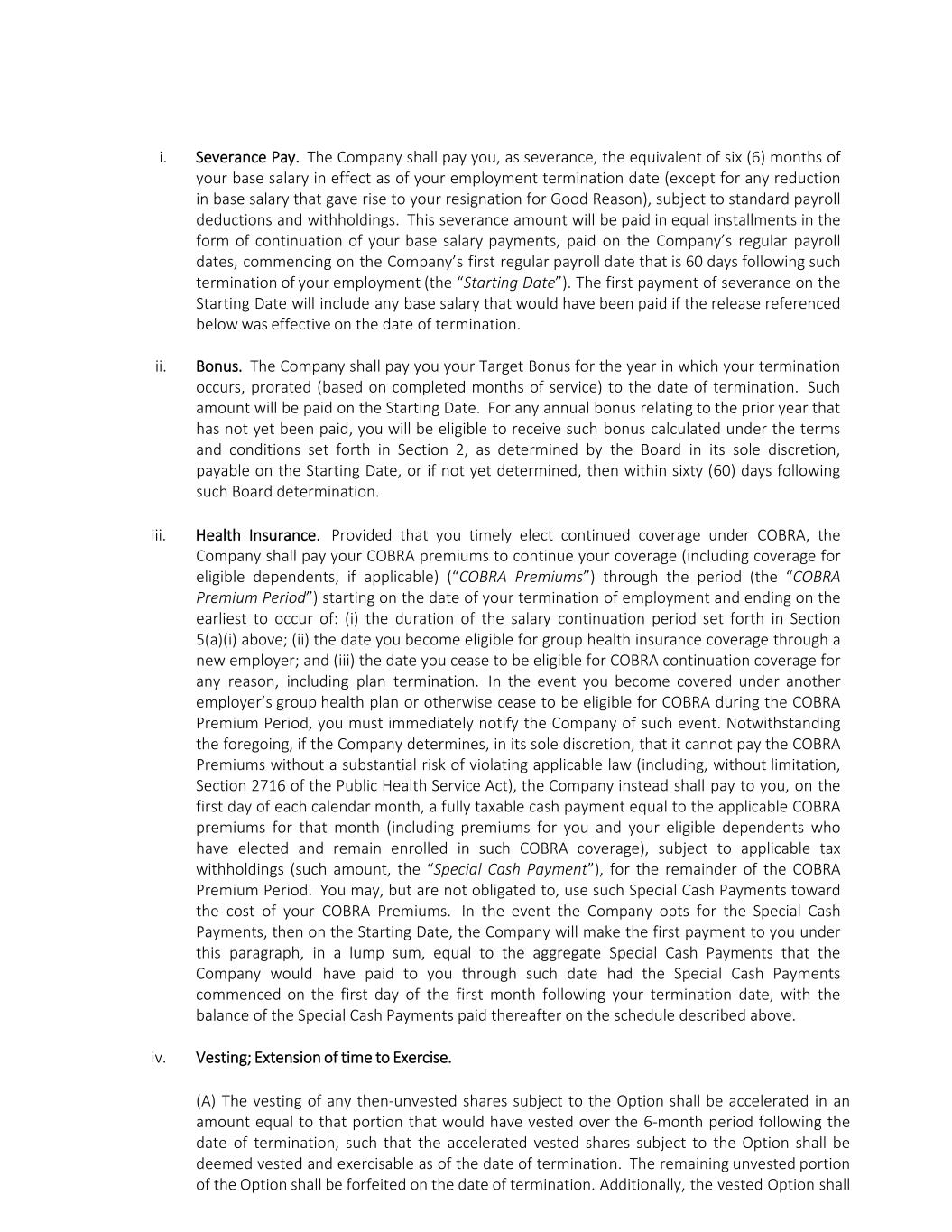 i. Severance Pay. The Company shall pay you, as severance, the equivalent of six (6) months of your base salary in effect as of your employment termination date (except for any reduction in base salary that gave rise to your resignation for Good Reason), subject to standard payroll deductions and withholdings. This severance amount will be paid in equal installments in the form of continuation of your base salary payments, paid on the Company’s regular payroll dates, commencing on the Company’s first regular payroll date that is 60 days following such termination of your employment (the “Starting Date”). The first payment of severance on the Starting Date will include any base salary that would have been paid if the release referenced below was effective on the date of termination. ii. Bonus. The Company shall pay you your Target Bonus for the year in which your termination occurs, prorated (based on completed months of service) to the date of termination. Such amount will be paid on the Starting Date. For any annual bonus relating to the prior year that has not yet been paid, you will be eligible to receive such bonus calculated under the terms and conditions set forth in Section 2, as determined by the Board in its sole discretion, payable on the Starting Date, or if not yet determined, then within sixty (60) days following such Board determination. iii. Health Insurance. Provided that you timely elect continued coverage under COBRA, the Company shall pay your COBRA premiums to continue your coverage (including coverage for eligible dependents, if applicable) (“COBRA Premiums”) through the period (the “COBRA Premium Period”) starting on the date of your termination of employment and ending on the earliest to occur of: (i) the duration of the salary continuation period set forth in Section 5(a)(i) above; (ii) the date you become eligible for group health insurance coverage through a new employer; and (iii) the date you cease to be eligible for COBRA continuation coverage for any reason, including plan termination. In the event you become covered under another employer’s group health plan or otherwise cease to be eligible for COBRA during the COBRA Premium Period, you must immediately notify the Company of such event. Notwithstanding the foregoing, if the Company determines, in its sole discretion, that it cannot pay the COBRA Premiums without a substantial risk of violating applicable law (including, without limitation, Section 2716 of the Public Health Service Act), the Company instead shall pay to you, on the first day of each calendar month, a fully taxable cash payment equal to the applicable COBRA premiums for that month (including premiums for you and your eligible dependents who have elected and remain enrolled in such COBRA coverage), subject to applicable tax withholdings (such amount, the “Special Cash Payment”), for the remainder of the COBRA Premium Period. You may, but are not obligated to, use such Special Cash Payments toward the cost of your COBRA Premiums. In the event the Company opts for the Special Cash Payments, then on the Starting Date, the Company will make the first payment to you under this paragraph, in a lump sum, equal to the aggregate Special Cash Payments that the Company would have paid to you through such date had the Special Cash Payments commenced on the first day of the first month following your termination date, with the balance of the Special Cash Payments paid thereafter on the schedule described above. iv. Vesting; Extension of time to Exercise. (A) The vesting of any then-unvested shares subject to the Option shall be accelerated in an amount equal to that portion that would have vested over the 6-month period following the date of termination, such that the accelerated vested shares subject to the Option shall be deemed vested and exercisable as of the date of termination. The remaining unvested portion of the Option shall be forfeited on the date of termination. Additionally, the vested Option shall