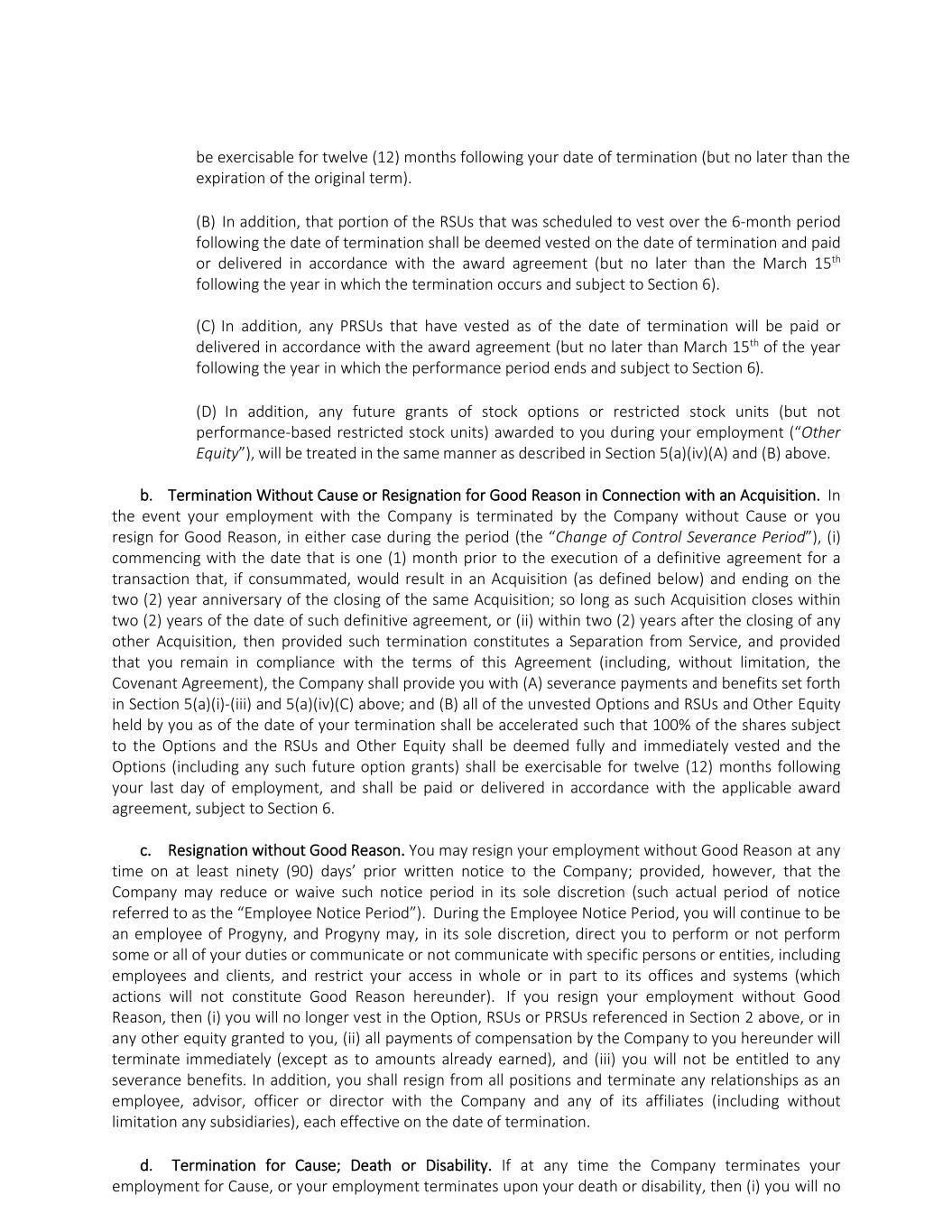 be exercisable for twelve (12) months following your date of termination (but no later than the expiration of the original term). (B) In addition, that portion of the RSUs that was scheduled to vest over the 6-month period following the date of termination shall be deemed vested on the date of termination and paid or delivered in accordance with the award agreement (but no later than the March 15th following the year in which the termination occurs and subject to Section 6). (C) In addition, any PRSUs that have vested as of the date of termination will be paid or delivered in accordance with the award agreement (but no later than March 15th of the year following the year in which the performance period ends and subject to Section 6). (D) In addition, any future grants of stock options or restricted stock units (but not performance-based restricted stock units) awarded to you during your employment (“Other Equity”), will be treated in the same manner as described in Section 5(a)(iv)(A) and (B) above. b. Termination Without Cause or Resignation for Good Reason in Connection with an Acquisition. In the event your employment with the Company is terminated by the Company without Cause or you resign for Good Reason, in either case during the period (the “Change of Control Severance Period”), (i) commencing with the date that is one (1) month prior to the execution of a definitive agreement for a transaction that, if consummated, would result in an Acquisition (as defined below) and ending on the two (2) year anniversary of the closing of the same Acquisition; so long as such Acquisition closes within two (2) years of the date of such definitive agreement, or (ii) within two (2) years after the closing of any other Acquisition, then provided such termination constitutes a Separation from Service, and provided that you remain in compliance with the terms of this Agreement (including, without limitation, the Covenant Agreement), the Company shall provide you with (A) severance payments and benefits set forth in Section 5(a)(i)-(iii) and 5(a)(iv)(C) above; and (B) all of the unvested Options and RSUs and Other Equity held by you as of the date of your termination shall be accelerated such that 100% of the shares subject to the Options and the RSUs and Other Equity shall be deemed fully and immediately vested and the Options (including any such future option grants) shall be exercisable for twelve (12) months following your last day of employment, and shall be paid or delivered in accordance with the applicable award agreement, subject to Section 6. c. Resignation without Good Reason. You may resign your employment without Good Reason at any time on at least ninety (90) days’ prior written notice to the Company; provided, however, that the Company may reduce or waive such notice period in its sole discretion (such actual period of notice referred to as the “Employee Notice Period”). During the Employee Notice Period, you will continue to be an employee of Progyny, and Progyny may, in its sole discretion, direct you to perform or not perform some or all of your duties or communicate or not communicate with specific persons or entities, including employees and clients, and restrict your access in whole or in part to its offices and systems (which actions will not constitute Good Reason hereunder). If you resign your employment without Good Reason, then (i) you will no longer vest in the Option, RSUs or PRSUs referenced in Section 2 above, or in any other equity granted to you, (ii) all payments of compensation by the Company to you hereunder will terminate immediately (except as to amounts already earned), and (iii) you will not be entitled to any severance benefits. In addition, you shall resign from all positions and terminate any relationships as an employee, advisor, officer or director with the Company and any of its affiliates (including without limitation any subsidiaries), each effective on the date of termination. d. Termination for Cause; Death or Disability. If at any time the Company terminates your employment for Cause, or your employment terminates upon your death or disability, then (i) you will no