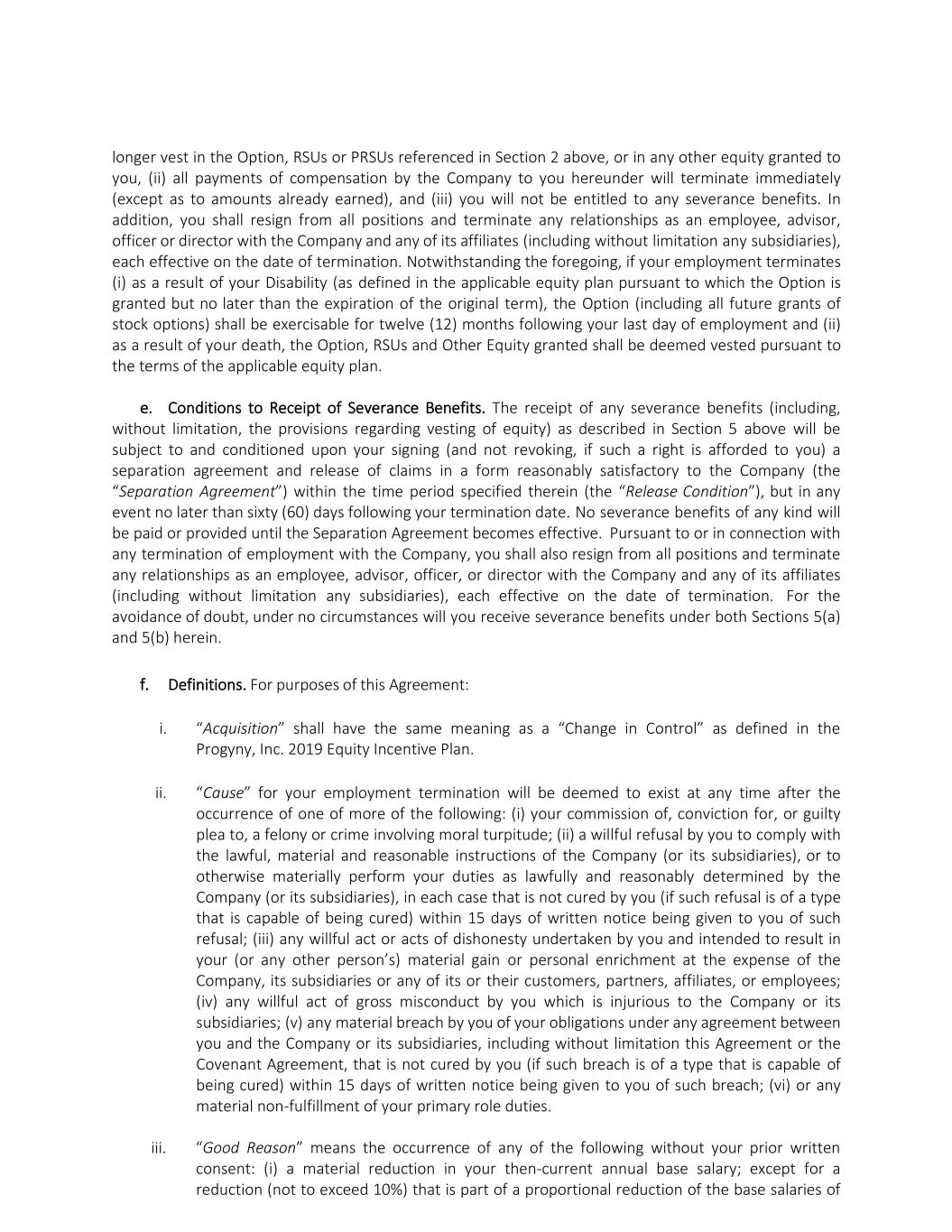 longer vest in the Option, RSUs or PRSUs referenced in Section 2 above, or in any other equity granted to you, (ii) all payments of compensation by the Company to you hereunder will terminate immediately (except as to amounts already earned), and (iii) you will not be entitled to any severance benefits. In addition, you shall resign from all positions and terminate any relationships as an employee, advisor, officer or director with the Company and any of its affiliates (including without limitation any subsidiaries), each effective on the date of termination. Notwithstanding the foregoing, if your employment terminates (i) as a result of your Disability (as defined in the applicable equity plan pursuant to which the Option is granted but no later than the expiration of the original term), the Option (including all future grants of stock options) shall be exercisable for twelve (12) months following your last day of employment and (ii) as a result of your death, the Option, RSUs and Other Equity granted shall be deemed vested pursuant to the terms of the applicable equity plan. e. Conditions to Receipt of Severance Benefits. The receipt of any severance benefits (including, without limitation, the provisions regarding vesting of equity) as described in Section 5 above will be subject to and conditioned upon your signing (and not revoking, if such a right is afforded to you) a separation agreement and release of claims in a form reasonably satisfactory to the Company (the “Separation Agreement”) within the time period specified therein (the “Release Condition”), but in any event no later than sixty (60) days following your termination date. No severance benefits of any kind will be paid or provided until the Separation Agreement becomes effective. Pursuant to or in connection with any termination of employment with the Company, you shall also resign from all positions and terminate any relationships as an employee, advisor, officer, or director with the Company and any of its affiliates (including without limitation any subsidiaries), each effective on the date of termination. For the avoidance of doubt, under no circumstances will you receive severance benefits under both Sections 5(a) and 5(b) herein. f. Definitions. For purposes of this Agreement: i. “Acquisition” shall have the same meaning as a “Change in Control” as defined in the Progyny, Inc. 2019 Equity Incentive Plan. ii. “Cause” for your employment termination will be deemed to exist at any time after the occurrence of one of more of the following: (i) your commission of, conviction for, or guilty plea to, a felony or crime involving moral turpitude; (ii) a willful refusal by you to comply with the lawful, material and reasonable instructions of the Company (or its subsidiaries), or to otherwise materially perform your duties as lawfully and reasonably determined by the Company (or its subsidiaries), in each case that is not cured by you (if such refusal is of a type that is capable of being cured) within 15 days of written notice being given to you of such refusal; (iii) any willful act or acts of dishonesty undertaken by you and intended to result in your (or any other person’s) material gain or personal enrichment at the expense of the Company, its subsidiaries or any of its or their customers, partners, affiliates, or employees; (iv) any willful act of gross misconduct by you which is injurious to the Company or its subsidiaries; (v) any material breach by you of your obligations under any agreement between you and the Company or its subsidiaries, including without limitation this Agreement or the Covenant Agreement, that is not cured by you (if such breach is of a type that is capable of being cured) within 15 days of written notice being given to you of such breach; (vi) or any material non-fulfillment of your primary role duties. iii. “Good Reason” means the occurrence of any of the following without your prior written consent: (i) a material reduction in your then-current annual base salary; except for a reduction (not to exceed 10%) that is part of a proportional reduction of the base salaries of