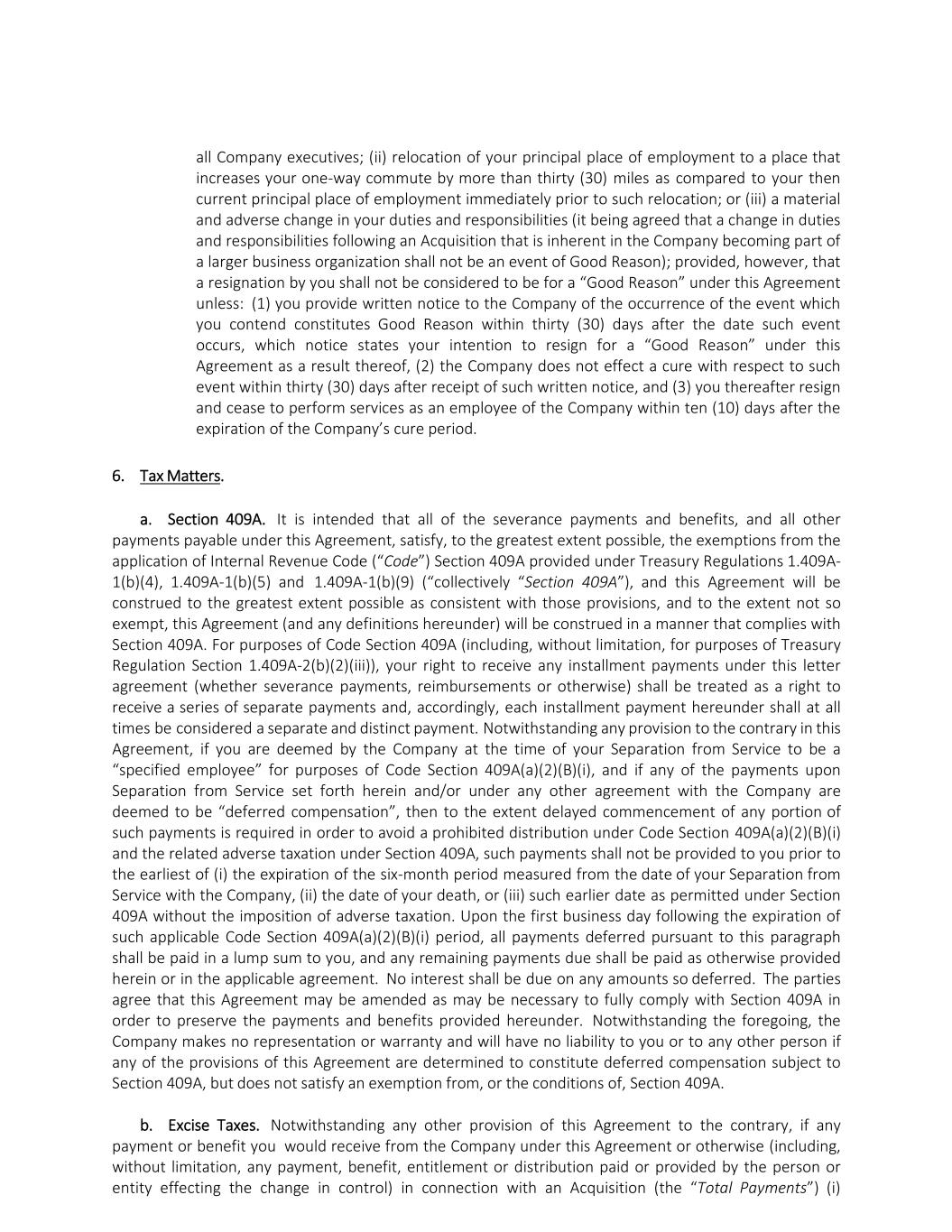 all Company executives; (ii) relocation of your principal place of employment to a place that increases your one-way commute by more than thirty (30) miles as compared to your then current principal place of employment immediately prior to such relocation; or (iii) a material and adverse change in your duties and responsibilities (it being agreed that a change in duties and responsibilities following an Acquisition that is inherent in the Company becoming part of a larger business organization shall not be an event of Good Reason); provided, however, that a resignation by you shall not be considered to be for a “Good Reason” under this Agreement unless: (1) you provide written notice to the Company of the occurrence of the event which you contend constitutes Good Reason within thirty (30) days after the date such event occurs, which notice states your intention to resign for a “Good Reason” under this Agreement as a result thereof, (2) the Company does not effect a cure with respect to such event within thirty (30) days after receipt of such written notice, and (3) you thereafter resign and cease to perform services as an employee of the Company within ten (10) days after the expiration of the Company’s cure period. 6. Tax Matters. a. Section 409A. It is intended that all of the severance payments and benefits, and all other payments payable under this Agreement, satisfy, to the greatest extent possible, the exemptions from the application of Internal Revenue Code (“Code”) Section 409A provided under Treasury Regulations 1.409A- 1(b)(4), 1.409A-1(b)(5) and 1.409A-1(b)(9) (“collectively “Section 409A”), and this Agreement will be construed to the greatest extent possible as consistent with those provisions, and to the extent not so exempt, this Agreement (and any definitions hereunder) will be construed in a manner that complies with Section 409A. For purposes of Code Section 409A (including, without limitation, for purposes of Treasury Regulation Section 1.409A-2(b)(2)(iii)), your right to receive any installment payments under this letter agreement (whether severance payments, reimbursements or otherwise) shall be treated as a right to receive a series of separate payments and, accordingly, each installment payment hereunder shall at all times be considered a separate and distinct payment. Notwithstanding any provision to the contrary in this Agreement, if you are deemed by the Company at the time of your Separation from Service to be a “specified employee” for purposes of Code Section 409A(a)(2)(B)(i), and if any of the payments upon Separation from Service set forth herein and/or under any other agreement with the Company are deemed to be “deferred compensation”, then to the extent delayed commencement of any portion of such payments is required in order to avoid a prohibited distribution under Code Section 409A(a)(2)(B)(i) and the related adverse taxation under Section 409A, such payments shall not be provided to you prior to the earliest of (i) the expiration of the six-month period measured from the date of your Separation from Service with the Company, (ii) the date of your death, or (iii) such earlier date as permitted under Section 409A without the imposition of adverse taxation. Upon the first business day following the expiration of such applicable Code Section 409A(a)(2)(B)(i) period, all payments deferred pursuant to this paragraph shall be paid in a lump sum to you, and any remaining payments due shall be paid as otherwise provided herein or in the applicable agreement. No interest shall be due on any amounts so deferred. The parties agree that this Agreement may be amended as may be necessary to fully comply with Section 409A in order to preserve the payments and benefits provided hereunder. Notwithstanding the foregoing, the Company makes no representation or warranty and will have no liability to you or to any other person if any of the provisions of this Agreement are determined to constitute deferred compensation subject to Section 409A, but does not satisfy an exemption from, or the conditions of, Section 409A. b. Excise Taxes. Notwithstanding any other provision of this Agreement to the contrary, if any payment or benefit you would receive from the Company under this Agreement or otherwise (including, without limitation, any payment, benefit, entitlement or distribution paid or provided by the person or entity effecting the change in control) in connection with an Acquisition (the “Total Payments”) (i)