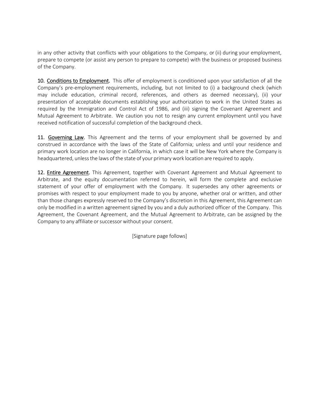 in any other activity that conflicts with your obligations to the Company, or (ii) during your employment, prepare to compete (or assist any person to prepare to compete) with the business or proposed business of the Company. 10. Conditions to Employment. This offer of employment is conditioned upon your satisfaction of all the Company’s pre-employment requirements, including, but not limited to (i) a background check (which may include education, criminal record, references, and others as deemed necessary), (ii) your presentation of acceptable documents establishing your authorization to work in the United States as required by the Immigration and Control Act of 1986, and (iii) signing the Covenant Agreement and Mutual Agreement to Arbitrate. We caution you not to resign any current employment until you have received notification of successful completion of the background check. 11. Governing Law. This Agreement and the terms of your employment shall be governed by and construed in accordance with the laws of the State of California; unless and until your residence and primary work location are no longer in California, in which case it will be New York where the Company is headquartered, unless the laws of the state of your primary work location are required to apply. 12. Entire Agreement. This Agreement, together with Covenant Agreement and Mutual Agreement to Arbitrate, and the equity documentation referred to herein, will form the complete and exclusive statement of your offer of employment with the Company. It supersedes any other agreements or promises with respect to your employment made to you by anyone, whether oral or written, and other than those changes expressly reserved to the Company’s discretion in this Agreement, this Agreement can only be modified in a written agreement signed by you and a duly authorized officer of the Company. This Agreement, the Covenant Agreement, and the Mutual Agreement to Arbitrate, can be assigned by the Company to any affiliate or successor without your consent. [Signature page follows]
