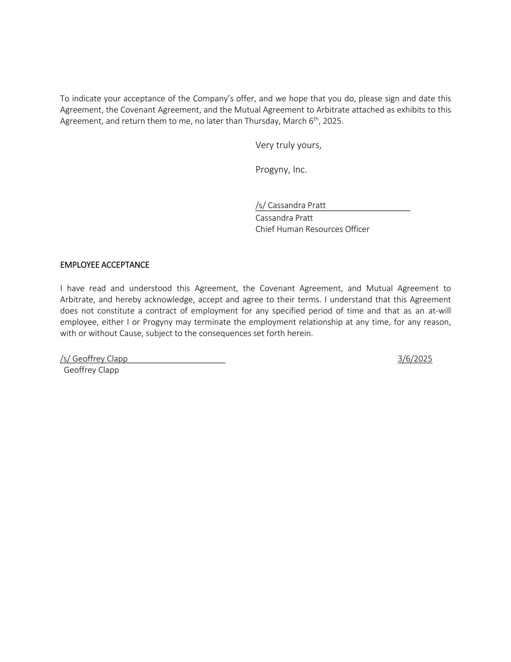 To indicate your acceptance of the Company’s offer, and we hope that you do, please sign and date this Agreement, the Covenant Agreement, and the Mutual Agreement to Arbitrate attached as exhibits to this Agreement, and return them to me, no later than Thursday, March 6th, 2025. Very truly yours, Progyny, Inc. /s/ Cassandra Pratt Cassandra Pratt Chief Human Resources Officer EMPLOYEE ACCEPTANCE I have read and understood this Agreement, the Covenant Agreement, and Mutual Agreement to Arbitrate, and hereby acknowledge, accept and agree to their terms. I understand that this Agreement does not constitute a contract of employment for any specified period of time and that as an at-will employee, either I or Progyny may terminate the employment relationship at any time, for any reason, with or without Cause, subject to the consequences set forth herein. /s/ Geoffrey Clapp 3/6/2025 Geoffrey Clapp
