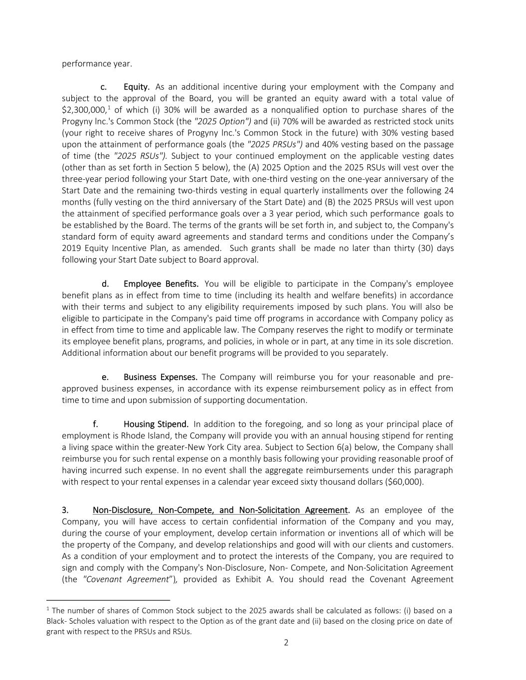 2 performance year. c. Equity. As an additional incentive during your employment with the Company and subject to the approval of the Board, you will be granted an equity award with a total value of $2,300,000,1 of which (i) 30% will be awarded as a nonqualified option to purchase shares of the Progyny lnc.'s Common Stock (the "2025 Option") and (ii) 70% will be awarded as restricted stock units (your right to receive shares of Progyny lnc.'s Common Stock in the future) with 30% vesting based upon the attainment of performance goals (the "2025 PRSUs") and 40% vesting based on the passage of time (the "2025 RSUs"). Subject to your continued employment on the applicable vesting dates (other than as set forth in Section 5 below), the (A) 2025 Option and the 2025 RSUs will vest over the three-year period following your Start Date, with one-third vesting on the one-year anniversary of the Start Date and the remaining two-thirds vesting in equal quarterly installments over the following 24 months (fully vesting on the third anniversary of the Start Date) and (B) the 2025 PRSUs will vest upon the attainment of specified performance goals over a 3 year period, which such performance goals to be established by the Board. The terms of the grants will be set forth in, and subject to, the Company's standard form of equity award agreements and standard terms and conditions under the Company’s 2019 Equity Incentive Plan, as amended. Such grants shall be made no later than thirty (30) days following your Start Date subject to Board approval. d. Employee Benefits. You will be eligible to participate in the Company's employee benefit plans as in effect from time to time (including its health and welfare benefits) in accordance with their terms and subject to any eligibility requirements imposed by such plans. You will also be eligible to participate in the Company's paid time off programs in accordance with Company policy as in effect from time to time and applicable law. The Company reserves the right to modify or terminate its employee benefit plans, programs, and policies, in whole or in part, at any time in its sole discretion. Additional information about our benefit programs will be provided to you separately. e. Business Expenses. The Company will reimburse you for your reasonable and pre- approved business expenses, in accordance with its expense reimbursement policy as in effect from time to time and upon submission of supporting documentation. f. Housing Stipend. In addition to the foregoing, and so long as your principal place of employment is Rhode Island, the Company will provide you with an annual housing stipend for renting a living space within the greater-New York City area. Subject to Section 6(a) below, the Company shall reimburse you for such rental expense on a monthly basis following your providing reasonable proof of having incurred such expense. In no event shall the aggregate reimbursements under this paragraph with respect to your rental expenses in a calendar year exceed sixty thousand dollars ($60,000). 3. Non-Disclosure, Non-Compete, and Non-Solicitation Agreement. As an employee of the Company, you will have access to certain confidential information of the Company and you may, during the course of your employment, develop certain information or inventions all of which will be the property of the Company, and develop relationships and good will with our clients and customers. As a condition of your employment and to protect the interests of the Company, you are required to sign and comply with the Company's Non-Disclosure, Non- Compete, and Non-Solicitation Agreement (the "Covenant Agreement”), provided as Exhibit A. You should read the Covenant Agreement 1 The number of shares of Common Stock subject to the 2025 awards shall be calculated as follows: (i) based on a Black- Scholes valuation with respect to the Option as of the grant date and (ii) based on the closing price on date of grant with respect to the PRSUs and RSUs.