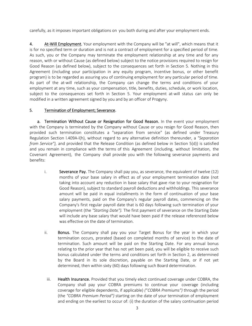 3 carefully, as it imposes important obligations on you both during and after your employment ends. 4. At-Will Employment. Your employment with the Company will be "at will", which means that it is for no specified term or duration and is not a contract of employment for a specified period of time. As such, you or the Company may terminate the employment relationship at any time and for any reason, with or without Cause (as defined below) subject to the notice provisions required to resign for Good Reason (as defined below), subject to the consequences set forth in Section 5. Nothing in this Agreement (including your participation in any equity program, incentive bonus, or other benefit program) is to be regarded as assuring you of continuing employment for any particular period of time. As part of the at-will relationship, the Company can change the terms and conditions of your employment at any time, such as your compensation, title, benefits, duties, schedule, or work location, subject to the consequences set forth in Section 5. Your employment at-will status can only be modified in a written agreement signed by you and by an officer of Progyny. 5. Termination of Employment; Severance. a. Termination Without Cause or Resignation for Good Reason. In the event your employment with the Company is terminated by the Company without Cause or you resign for Good Reason, then provided such termination constitutes a "separation from service" (as defined under Treasury Regulation Section l.409A-l(h), without regard to any alternative definition thereunder, a "Separation from Service"), and provided that the Release Condition (as defined below in Section 5(d)) is satisfied and you remain in compliance with the terms of this Agreement (including, without limitation, the Covenant Agreement), the Company shall provide you with the following severance payments and benefits: i. Severance Pay. The Company shall pay you, as severance, the equivalent of twelve (12) months of your base salary in effect as of your employment termination date (not taking into account any reduction in base salary that gave rise to your resignation for Good Reason), subject to standard payroll deductions and withholdings. This severance amount will be paid in equal installments in the form of continuation of your base salary payments, paid on the Company's regular payroll dates, commencing on the Company's first regular payroll date that is 60 days following such termination of your employment (the "Starting Date"). The first payment of severance on the Starting Date will include any base salary that would have been paid if the release referenced below was effective on the date of termination. ii. Bonus. The Company shall pay you your Target Bonus for the year in which your termination occurs, prorated (based on completed months of service) to the date of termination. Such amount will be paid on the Starting Date. For any annual bonus relating to the prior year that has not yet been paid, you will be eligible to receive such bonus calculated under the terms and conditions set forth in Section 2, as determined by the Board in its sole discretion, payable on the Starting Date, or if not yet determined, then within sixty (60) days following such Board determination. iii. Health Insurance. Provided that you timely elect continued coverage under COBRA, the Company shall pay your COBRA premiums to continue your coverage (including coverage for eligible dependents, if applicable) (“COBRA Premiums") through the period (the "COBRA Premium Period") starting on the date of your termination of employment and ending on the earliest to occur of: (i) the duration of the salary continuation period