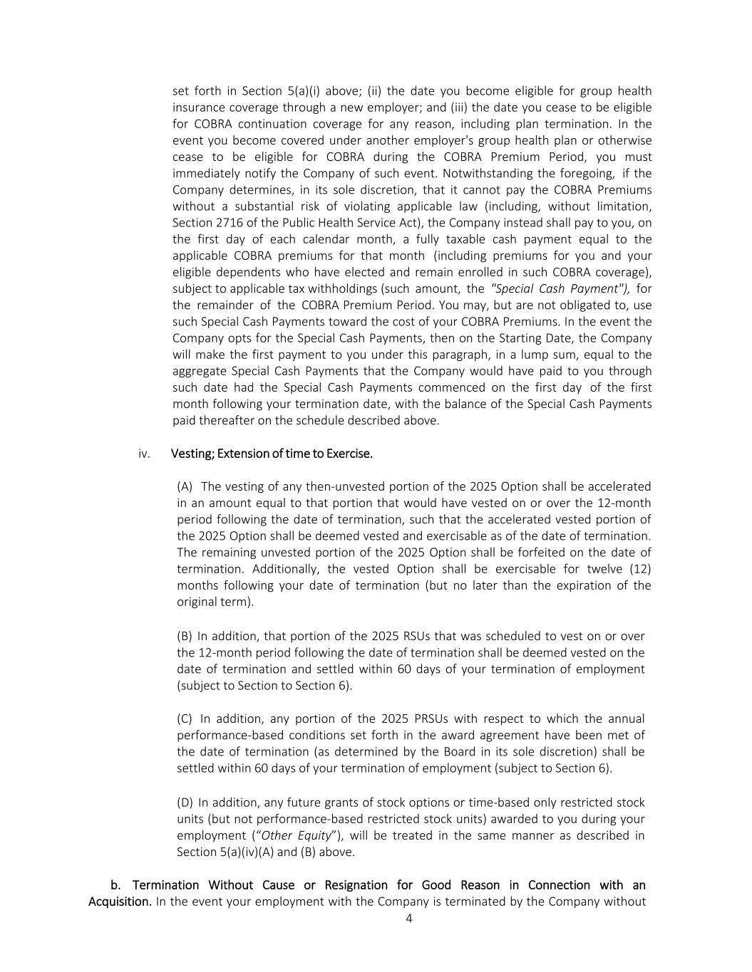 4 set forth in Section 5(a)(i) above; (ii) the date you become eligible for group health insurance coverage through a new employer; and (iii) the date you cease to be eligible for COBRA continuation coverage for any reason, including plan termination. In the event you become covered under another employer's group health plan or otherwise cease to be eligible for COBRA during the COBRA Premium Period, you must immediately notify the Company of such event. Notwithstanding the foregoing, if the Company determines, in its sole discretion, that it cannot pay the COBRA Premiums without a substantial risk of violating applicable law (including, without limitation, Section 2716 of the Public Health Service Act), the Company instead shall pay to you, on the first day of each calendar month, a fully taxable cash payment equal to the applicable COBRA premiums for that month (including premiums for you and your eligible dependents who have elected and remain enrolled in such COBRA coverage), subject to applicable tax withholdings (such amount, the "Special Cash Payment"), for the remainder of the COBRA Premium Period. You may, but are not obligated to, use such Special Cash Payments toward the cost of your COBRA Premiums. In the event the Company opts for the Special Cash Payments, then on the Starting Date, the Company will make the first payment to you under this paragraph, in a lump sum, equal to the aggregate Special Cash Payments that the Company would have paid to you through such date had the Special Cash Payments commenced on the first day of the first month following your termination date, with the balance of the Special Cash Payments paid thereafter on the schedule described above. iv. Vesting; Extension of time to Exercise. (A) The vesting of any then-unvested portion of the 2025 Option shall be accelerated in an amount equal to that portion that would have vested on or over the 12-month period following the date of termination, such that the accelerated vested portion of the 2025 Option shall be deemed vested and exercisable as of the date of termination. The remaining unvested portion of the 2025 Option shall be forfeited on the date of termination. Additionally, the vested Option shall be exercisable for twelve (12) months following your date of termination (but no later than the expiration of the original term). (B) In addition, that portion of the 2025 RSUs that was scheduled to vest on or over the 12-month period following the date of termination shall be deemed vested on the date of termination and settled within 60 days of your termination of employment (subject to Section to Section 6). (C) In addition, any portion of the 2025 PRSUs with respect to which the annual performance-based conditions set forth in the award agreement have been met of the date of termination (as determined by the Board in its sole discretion) shall be settled within 60 days of your termination of employment (subject to Section 6). (D) In addition, any future grants of stock options or time-based only restricted stock units (but not performance-based restricted stock units) awarded to you during your employment (“Other Equity”), will be treated in the same manner as described in Section 5(a)(iv)(A) and (B) above. b. Termination Without Cause or Resignation for Good Reason in Connection with an Acquisition. In the event your employment with the Company is terminated by the Company without