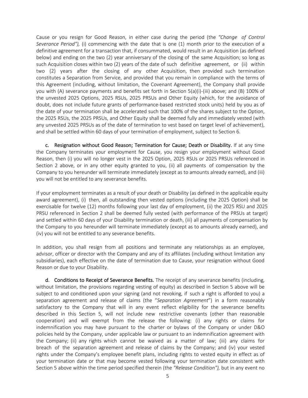 5 Cause or you resign for Good Reason, in either case during the period (the "Change of Control Severance Period"), (i) commencing with the date that is one (1) month prior to the execution of a definitive agreement for a transaction that, if consummated, would result in an Acquisition (as defined below) and ending on the two (2) year anniversary of the closing of the same Acquisition; so long as such Acquisition closes within two (2) years of the date of such definitive agreement, or (ii) within two (2) years after the closing of any other Acquisition, then provided such termination constitutes a Separation from Service, and provided that you remain in compliance with the terms of this Agreement (including, without limitation, the Covenant Agreement), the Company shall provide you with (A) severance payments and benefits set forth in Section 5(a)(i)-(iii) above; and (B) 100% of the unvested 2025 Options, 2025 RSUs, 2025 PRSUs and Other Equity (which, for the avoidance of doubt, does not include future grants of performance-based restricted stock units) held by you as of the date of your termination shall be accelerated such that 100% of the shares subject to the Option, the 2025 RSUs, the 2025 PRSUs, and Other Equity shall be deemed fully and immediately vested (with any unvested 2025 PRSUs as of the date of termination to vest based on target level of achievement), and shall be settled within 60 days of your termination of employment, subject to Section 6. c. Resignation without Good Reason; Termination for Cause; Death or Disability. If at any time the Company terminates your employment for Cause, you resign your employment without Good Reason, then (i) you will no longer vest in the 2025 Option, 2025 RSUs or 2025 PRSUs referenced in Section 2 above, or in any other equity granted to you, (ii) all payments of compensation by the Company to you hereunder will terminate immediately (except as to amounts already earned), and (iii) you will not be entitled to any severance benefits. If your employment terminates as a result of your death or Disability (as defined in the applicable equity award agreement), (i) then, all outstanding then vested options (including the 2025 Option) shall be exercisable for twelve (12) months following your last day of employment, (ii) the 2025 RSU and 2025 PRSU referenced in Section 2 shall be deemed fully vested (with performance of the PRSUs at target) and settled within 60 days of your Disability termination or death, (iii) all payments of compensation by the Company to you hereunder will terminate immediately (except as to amounts already earned), and (iv) you will not be entitled to any severance benefits. In addition, you shall resign from all positions and terminate any relationships as an employee, advisor, officer or director with the Company and any of its affiliates (including without limitation any subsidiaries), each effective on the date of termination due to Cause, your resignation without Good Reason or due to your Disability. d. Conditions to Receipt of Severance Benefits. The receipt of any severance benefits (including, without limitation, the provisions regarding vesting of equity) as described in Section 5 above will be subject to and conditioned upon your signing (and not revoking, if such a right is afforded to you) a separation agreement and release of claims (the “Separation Agreement”) in a form reasonably satisfactory to the Company that will in any event reflect eligibility for the severance benefits described in this Section 5, will not include new restrictive covenants (other than reasonable cooperation) and will exempt from the release the following: (i) any rights or claims for indemnification you may have pursuant to the charter or bylaws of the Company or under D&O policies held by the Company, under applicable law or pursuant to an indemnification agreement with the Company; (ii) any rights which cannot be waived as a matter of law; (iii) any claims for breach of the separation agreement and release of claims by the Company; and (iv) your vested rights under the Company’s employee benefit plans, including rights to vested equity in effect as of your termination date or that may become vested following your termination date consistent with Section 5 above within the time period specified therein (the "Release Condition"), but in any event no