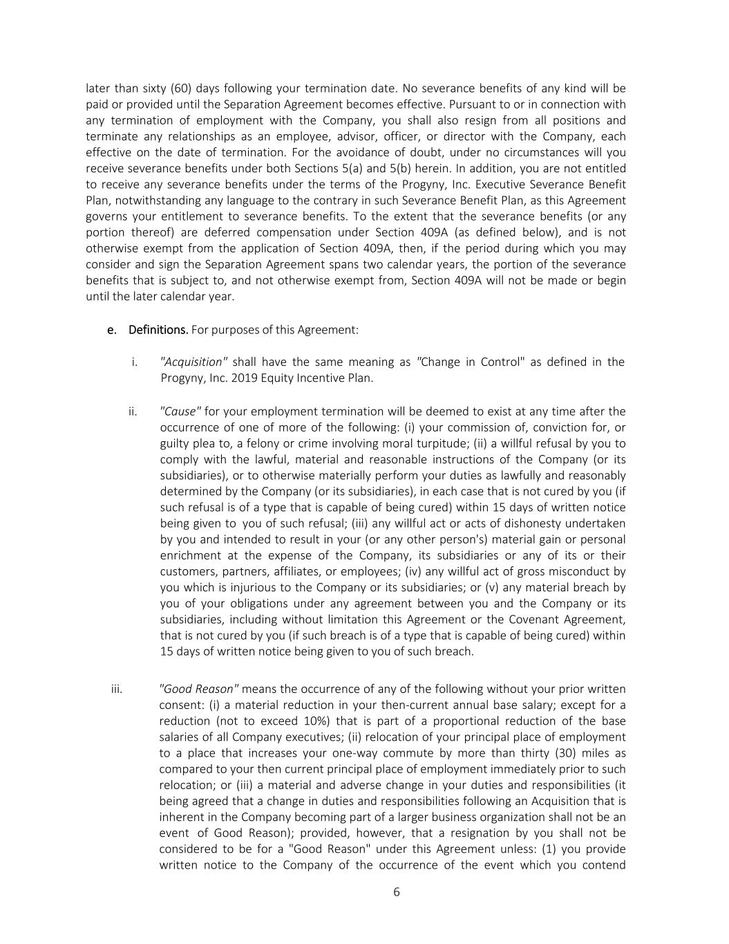6 later than sixty (60) days following your termination date. No severance benefits of any kind will be paid or provided until the Separation Agreement becomes effective. Pursuant to or in connection with any termination of employment with the Company, you shall also resign from all positions and terminate any relationships as an employee, advisor, officer, or director with the Company, each effective on the date of termination. For the avoidance of doubt, under no circumstances will you receive severance benefits under both Sections 5(a) and 5(b) herein. In addition, you are not entitled to receive any severance benefits under the terms of the Progyny, Inc. Executive Severance Benefit Plan, notwithstanding any language to the contrary in such Severance Benefit Plan, as this Agreement governs your entitlement to severance benefits. To the extent that the severance benefits (or any portion thereof) are deferred compensation under Section 409A (as defined below), and is not otherwise exempt from the application of Section 409A, then, if the period during which you may consider and sign the Separation Agreement spans two calendar years, the portion of the severance benefits that is subject to, and not otherwise exempt from, Section 409A will not be made or begin until the later calendar year. e. Definitions. For purposes of this Agreement: i. "Acquisition" shall have the same meaning as "Change in Control" as defined in the Progyny, Inc. 2019 Equity Incentive Plan. ii. "Cause" for your employment termination will be deemed to exist at any time after the occurrence of one of more of the following: (i) your commission of, conviction for, or guilty plea to, a felony or crime involving moral turpitude; (ii) a willful refusal by you to comply with the lawful, material and reasonable instructions of the Company (or its subsidiaries), or to otherwise materially perform your duties as lawfully and reasonably determined by the Company (or its subsidiaries), in each case that is not cured by you (if such refusal is of a type that is capable of being cured) within 15 days of written notice being given to you of such refusal; (iii) any willful act or acts of dishonesty undertaken by you and intended to result in your (or any other person's) material gain or personal enrichment at the expense of the Company, its subsidiaries or any of its or their customers, partners, affiliates, or employees; (iv) any willful act of gross misconduct by you which is injurious to the Company or its subsidiaries; or (v) any material breach by you of your obligations under any agreement between you and the Company or its subsidiaries, including without limitation this Agreement or the Covenant Agreement, that is not cured by you (if such breach is of a type that is capable of being cured) within 15 days of written notice being given to you of such breach. iii. "Good Reason" means the occurrence of any of the following without your prior written consent: (i) a material reduction in your then-current annual base salary; except for a reduction (not to exceed 10%) that is part of a proportional reduction of the base salaries of all Company executives; (ii) relocation of your principal place of employment to a place that increases your one-way commute by more than thirty (30) miles as compared to your then current principal place of employment immediately prior to such relocation; or (iii) a material and adverse change in your duties and responsibilities (it being agreed that a change in duties and responsibilities following an Acquisition that is inherent in the Company becoming part of a larger business organization shall not be an event of Good Reason); provided, however, that a resignation by you shall not be considered to be for a "Good Reason" under this Agreement unless: (1) you provide written notice to the Company of the occurrence of the event which you contend