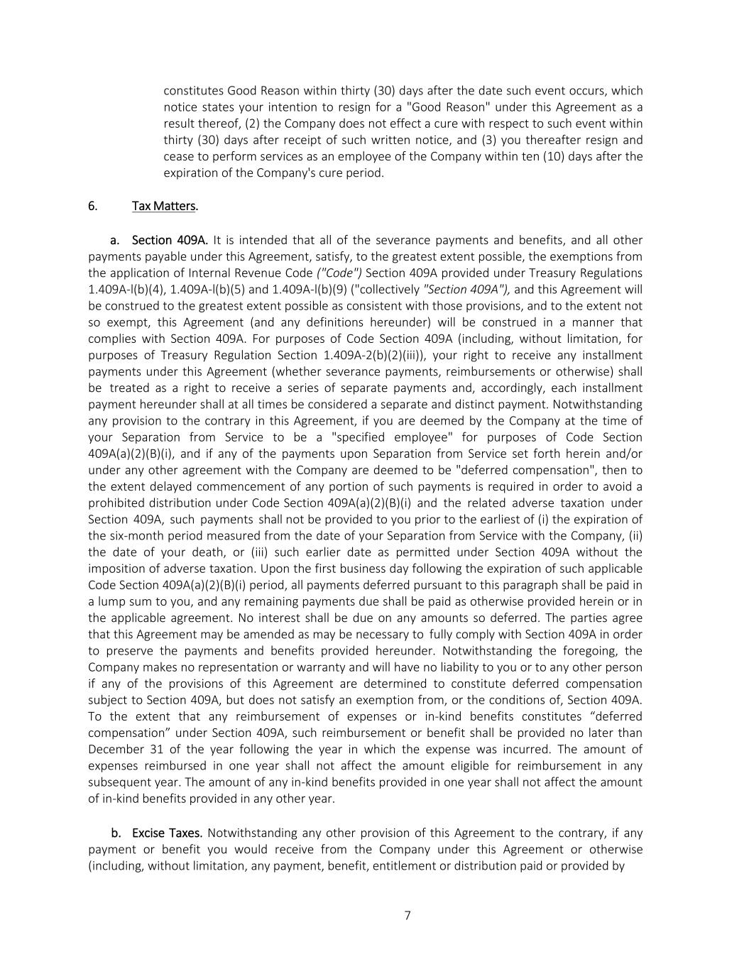 7 constitutes Good Reason within thirty (30) days after the date such event occurs, which notice states your intention to resign for a "Good Reason" under this Agreement as a result thereof, (2) the Company does not effect a cure with respect to such event within thirty (30) days after receipt of such written notice, and (3) you thereafter resign and cease to perform services as an employee of the Company within ten (10) days after the expiration of the Company's cure period. 6. Tax Matters. a. Section 409A. It is intended that all of the severance payments and benefits, and all other payments payable under this Agreement, satisfy, to the greatest extent possible, the exemptions from the application of Internal Revenue Code ("Code") Section 409A provided under Treasury Regulations 1.409A-l(b)(4), 1.409A-l(b)(5) and 1.409A-l(b)(9) ("collectively "Section 409A"), and this Agreement will be construed to the greatest extent possible as consistent with those provisions, and to the extent not so exempt, this Agreement (and any definitions hereunder) will be construed in a manner that complies with Section 409A. For purposes of Code Section 409A (including, without limitation, for purposes of Treasury Regulation Section 1.409A-2(b)(2)(iii)), your right to receive any installment payments under this Agreement (whether severance payments, reimbursements or otherwise) shall be treated as a right to receive a series of separate payments and, accordingly, each installment payment hereunder shall at all times be considered a separate and distinct payment. Notwithstanding any provision to the contrary in this Agreement, if you are deemed by the Company at the time of your Separation from Service to be a "specified employee" for purposes of Code Section 409A(a)(2)(B)(i), and if any of the payments upon Separation from Service set forth herein and/or under any other agreement with the Company are deemed to be "deferred compensation", then to the extent delayed commencement of any portion of such payments is required in order to avoid a prohibited distribution under Code Section 409A(a)(2)(B)(i) and the related adverse taxation under Section 409A, such payments shall not be provided to you prior to the earliest of (i) the expiration of the six-month period measured from the date of your Separation from Service with the Company, (ii) the date of your death, or (iii) such earlier date as permitted under Section 409A without the imposition of adverse taxation. Upon the first business day following the expiration of such applicable Code Section 409A(a)(2)(B)(i) period, all payments deferred pursuant to this paragraph shall be paid in a lump sum to you, and any remaining payments due shall be paid as otherwise provided herein or in the applicable agreement. No interest shall be due on any amounts so deferred. The parties agree that this Agreement may be amended as may be necessary to fully comply with Section 409A in order to preserve the payments and benefits provided hereunder. Notwithstanding the foregoing, the Company makes no representation or warranty and will have no liability to you or to any other person if any of the provisions of this Agreement are determined to constitute deferred compensation subject to Section 409A, but does not satisfy an exemption from, or the conditions of, Section 409A. To the extent that any reimbursement of expenses or in-kind benefits constitutes “deferred compensation” under Section 409A, such reimbursement or benefit shall be provided no later than December 31 of the year following the year in which the expense was incurred. The amount of expenses reimbursed in one year shall not affect the amount eligible for reimbursement in any subsequent year. The amount of any in-kind benefits provided in one year shall not affect the amount of in-kind benefits provided in any other year. b. Excise Taxes. Notwithstanding any other provision of this Agreement to the contrary, if any payment or benefit you would receive from the Company under this Agreement or otherwise (including, without limitation, any payment, benefit, entitlement or distribution paid or provided by