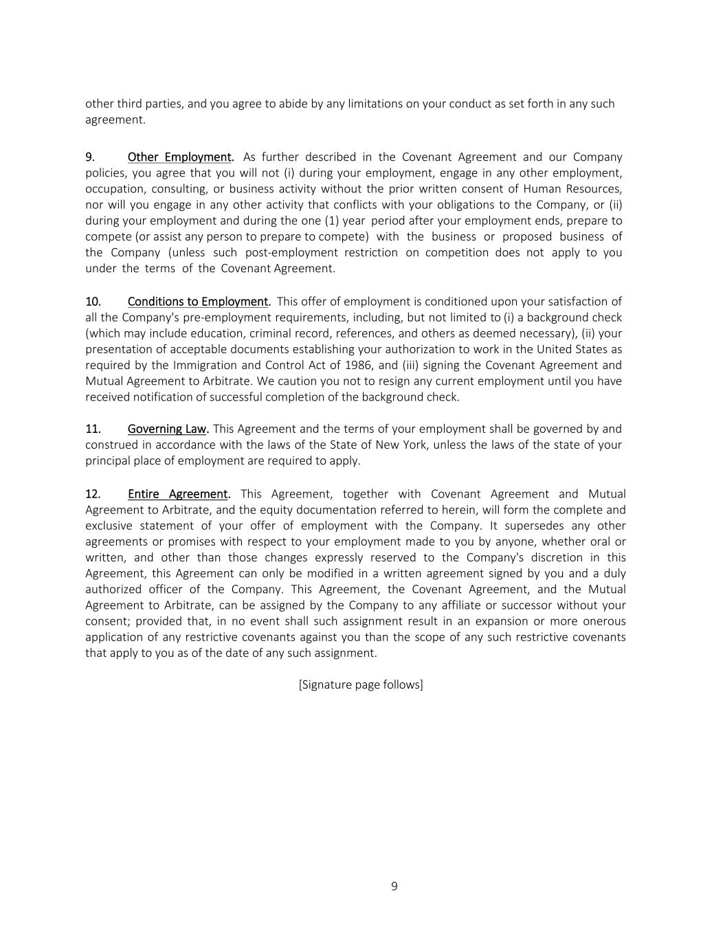 9 other third parties, and you agree to abide by any limitations on your conduct as set forth in any such agreement. 9. Other Employment. As further described in the Covenant Agreement and our Company policies, you agree that you will not (i) during your employment, engage in any other employment, occupation, consulting, or business activity without the prior written consent of Human Resources, nor will you engage in any other activity that conflicts with your obligations to the Company, or (ii) during your employment and during the one (1) year period after your employment ends, prepare to compete (or assist any person to prepare to compete) with the business or proposed business of the Company (unless such post-employment restriction on competition does not apply to you under the terms of the Covenant Agreement. 10. Conditions to Employment. This offer of employment is conditioned upon your satisfaction of all the Company's pre-employment requirements, including, but not limited to (i) a background check (which may include education, criminal record, references, and others as deemed necessary), (ii) your presentation of acceptable documents establishing your authorization to work in the United States as required by the Immigration and Control Act of 1986, and (iii) signing the Covenant Agreement and Mutual Agreement to Arbitrate. We caution you not to resign any current employment until you have received notification of successful completion of the background check. 11. Governing Law. This Agreement and the terms of your employment shall be governed by and construed in accordance with the laws of the State of New York, unless the laws of the state of your principal place of employment are required to apply. 12. Entire Agreement. This Agreement, together with Covenant Agreement and Mutual Agreement to Arbitrate, and the equity documentation referred to herein, will form the complete and exclusive statement of your offer of employment with the Company. It supersedes any other agreements or promises with respect to your employment made to you by anyone, whether oral or written, and other than those changes expressly reserved to the Company's discretion in this Agreement, this Agreement can only be modified in a written agreement signed by you and a duly authorized officer of the Company. This Agreement, the Covenant Agreement, and the Mutual Agreement to Arbitrate, can be assigned by the Company to any affiliate or successor without your consent; provided that, in no event shall such assignment result in an expansion or more onerous application of any restrictive covenants against you than the scope of any such restrictive covenants that apply to you as of the date of any such assignment. [Signature page follows]