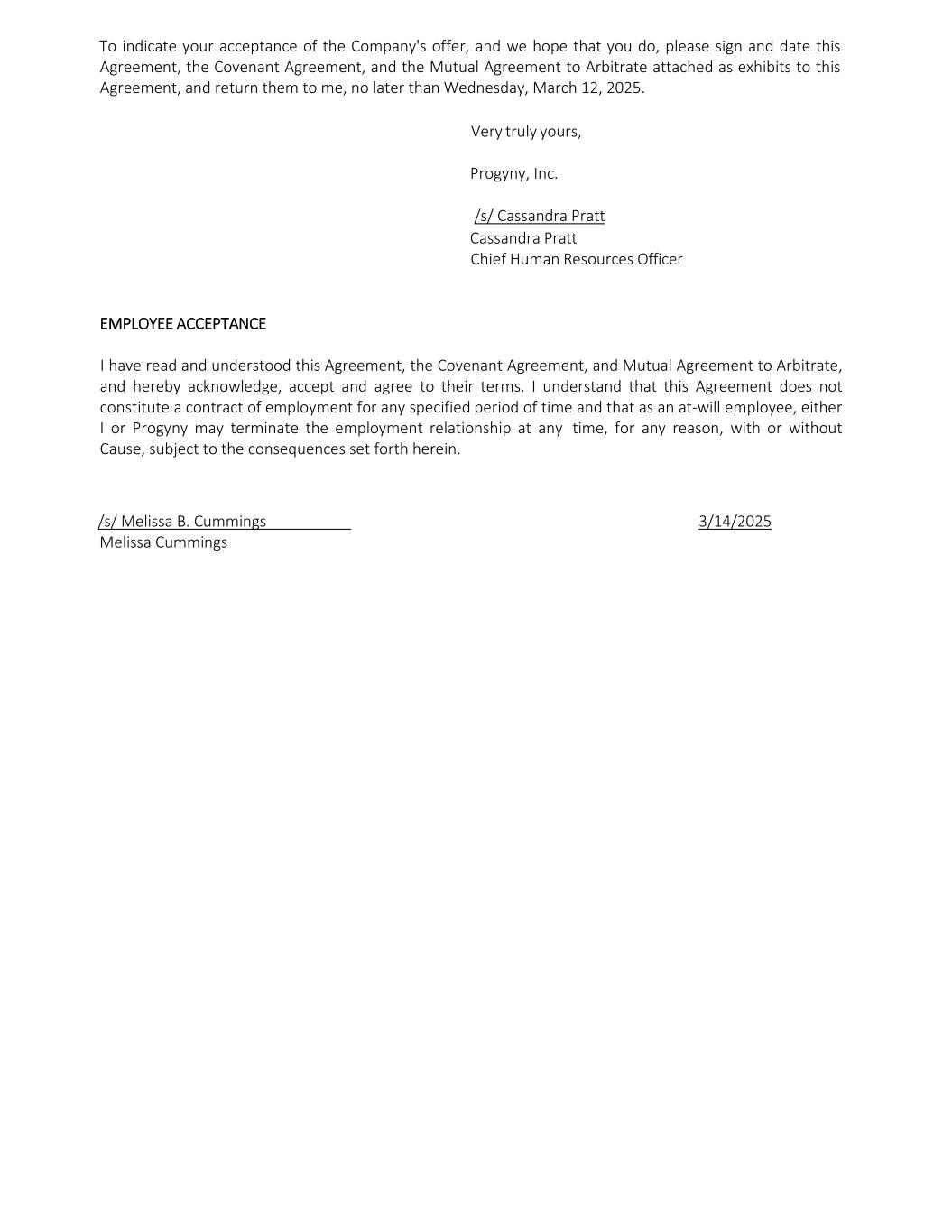 To indicate your acceptance of the Company's offer, and we hope that you do, please sign and date this Agreement, the Covenant Agreement, and the Mutual Agreement to Arbitrate attached as exhibits to this Agreement, and return them to me, no later than Wednesday, March 12, 2025. Very truly yours, Progyny, Inc. /s/ Cassandra Pratt Cassandra Pratt Chief Human Resources Officer EMPLOYEE ACCEPTANCE I have read and understood this Agreement, the Covenant Agreement, and Mutual Agreement to Arbitrate, and hereby acknowledge, accept and agree to their terms. I understand that this Agreement does not constitute a contract of employment for any specified period of time and that as an at-will employee, either I or Progyny may terminate the employment relationship at any time, for any reason, with or without Cause, subject to the consequences set forth herein. /s/ Melissa B. Cummings 3/14/2025 Melissa Cummings