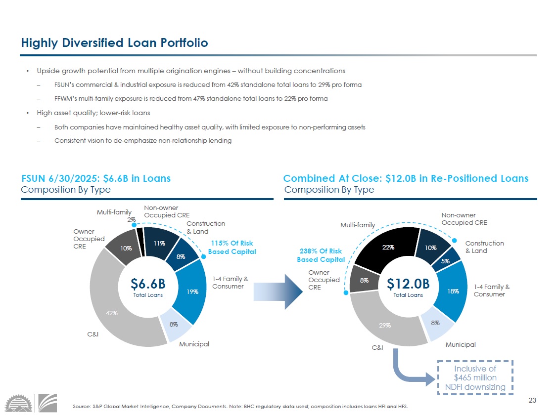 Note: BHC regulatory data used; composition includes loans HFI and HF S. Highly Diversified Loan Portfolio • Upside growth potential from multiple origination engines – without building concentrations – FSUN’s commercial & industrial exposure is reduced from 42% standalone total loans to 29% pro forma – FFWM’s multi - family exposure is reduced from 47% standalone total loans to 22% pro forma • High asset quality; lower - risk loans – Both companies have maintained healthy asset quality, with limited exposure to non - performing assets – Consistent vision to de - emphasize non - relationship lending Combined At Close: $12.0B in Re - Positioned Loans FSUN 6/30/2025: $6.6B in Loans 42% 10% 2% 11% 8% 19% 8% Composition By Type Composition By Type 29% 8% 22% 10% 5% 18% 8% Owner Occupied CRE Multi - family Non - owner Occupied CRE Construction & Land 1 - 4 Family & Consumer C&I Owner Occupied CRE 115% Of Risk Based Capital 238% Of Risk Based Capital $6.6B Total Loans $12.0B Total Loans Municipal Multi - family Non - owner Occupied CRE C&I Construction & Land 1 - 4 Family & Consumer Municipal Inclusive of $465 million NDFI downsizing 24 12% 17% 19% 42% 10% 14% 25% 10% 45% 6% Well - Balanced and Diverse Combined Deposit Base • Core deposits are well balanced across both consumer and commercial franchises • Access to diverse markets and funding sources enables low beta – Pro forma beta of ~50.1% • Limited reliance on wholesale funding – Plan in place to significantly reduce legacy FFWM wholesale within 18 months post - close Combined At Close: $14.2B in Re - Positioned Deposits Composition By Type Composition By Type Source: S&P Capital Market Intelligence.