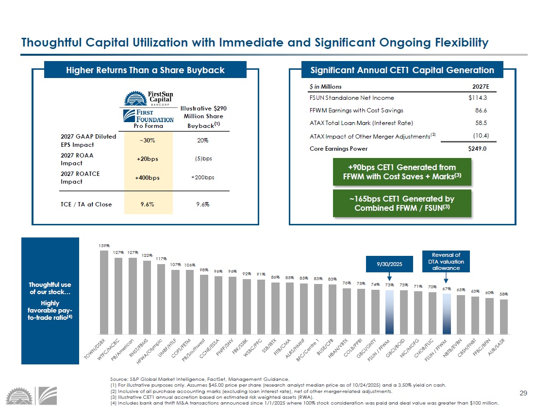 (1) For illustrative purposes only. Assumes $45.00 price per share (research analyst median price as of 10/24/2025) and a 3.5 0% yield on cash. (2) Inclusive of all purchase accounting marks (excluding loan interest rate), net of other merger - related adjustments. (3) Illustrative CET1 annual accretion based on estimated risk weighted assets (RWA). (4) Includes bank and thrift M&A transactions announced since 1/1/2025 where 100% stock consideration was paid and deal value wa s greater than $100 million. Thoughtful Capital Utilization with Immediate and Significant Ongoing Flexibility Pro Forma Illustrative $290 Million Share Buyback (1) 2027 GAAP Diluted EPS Impact ~30% 20% 2027 ROAA Impact +20bps (5)bps 2027 ROATCE Impact +400bps +200bps TCE / TA at Close 9.6% 9.6% Higher Returns Than a Share Buyback $ in Millions 2027E FSUN Standalone Net Income $114.3 FFWM Earnings with Cost Savings 86.6 ATAX Total Loan Mark (Interest Rate) 58.5 ATAX Impact of Other Merger Adjustments (2) (10.4) Core Earnings Power $249.0 Significant Annual CET1 Capital Generation +90 bps CET1 Generated from FFWM with Cost Saves + Marks (3) ~165bps CET1 Generated by Combined FFWM / FSUN (3) Reversal of DTA valuation allowance 9/30/2025 Thoughtful use of our stock… Highly favorable pay - to - trade ratio (4)