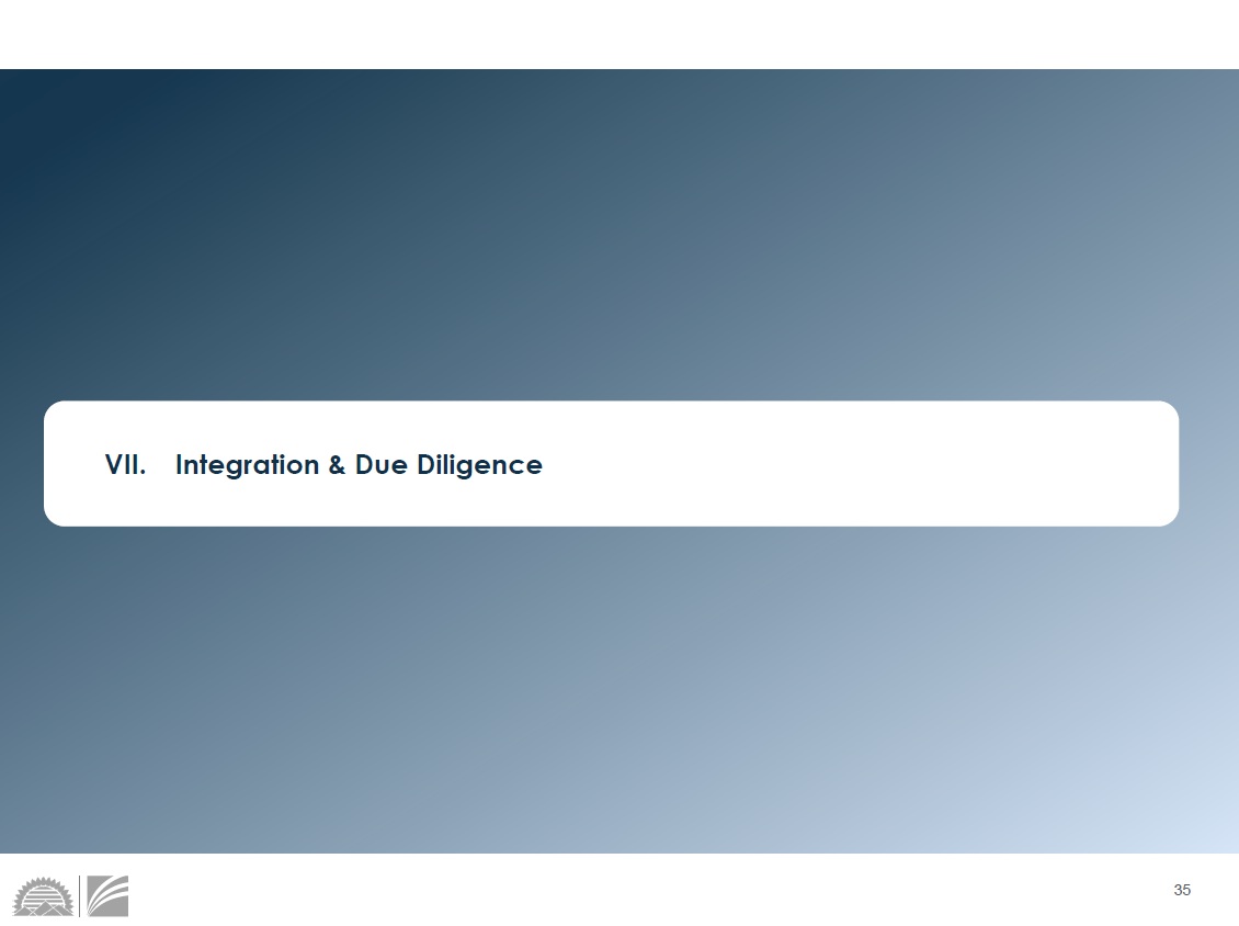 Debt: – FSUN redeemed a $40 million tranche of subordinated debt in 2025Q4 – Pro forma model assumes a redemption of FFWM’s $24 million tranche of subordinated debt – FFWM remaining subordinated debt tranche of $150 million assumed to remain as part of pro forma balance sheet • Intermediate/long - term capital management strategy will be dynamic & opportunistic Capital Management Strategy Pro Forma @ Pro Forma @ 13.8% 10.5% 11.4% 12.7% 12.6% 11.8% FSUN @ 6/30/2025 Close 2026 2027 2028 $13 - $30B Peer Median 34 Interest Rate Risk Mitigation Plan Fair Value / Goodwill Hedging Strategy Post - Close Profitability Hedge • Pro forma NII sensitivity shifts from more asset sensitive to more liability sensitive (unhedged) • Objective: stable NII profile across multiple IRR scenarios (slightly asset sensitive to neutral positioning) • Intend to implement post close hedging strategy to mitigate pro forma sensitivity profile • Illustrative 2027 ALCO simulation below doesn’t include (conservatively) full overlay of FSUN playbook on FFWM; re - mix will re - position combined organization to be less liability sensitive • Hedging strategy executed concurrent with merger announcement • Objective: mitigate risk of change in fair value marks in rising or falling rates • Timing focus: announcement to closing date Consolidated CET1 @ Close 7.50% 8.50% 9.50% 10.50% 11.50% 12.50% -150 -100 -50 Base 50 100 150 Unhedged Hedged Rate Shock +100 Rate Hike +200 Rate Hike $ in millions Unhedged Hedged Unhedged Hedged Net Interest Income $647 $626 $640 $617 $642 Net Income $249 $233 $244 $226 $245 EPS $5.24 $4.90 $5.14 $4.75 $5.16 NIM (%) 3.99% 3.87% 3.95% 3.81% 3.96% ROAA (%) 1.45% 1.35% 1.42% 1.31% 1.42% ROATCE (%) 13.3% 12.5% 13.1% 12.1% 13.2% Base Model Two hedging strategies to be executed: 1) Fair Value / Goodwill Hedging Strategy (announcement - to close time period) 2) Post - closing Profitability Hedge - mitigating remaining FFWM NIM sensitivity risk in an up rate environment 35 = VII. Integration & Due Diligence