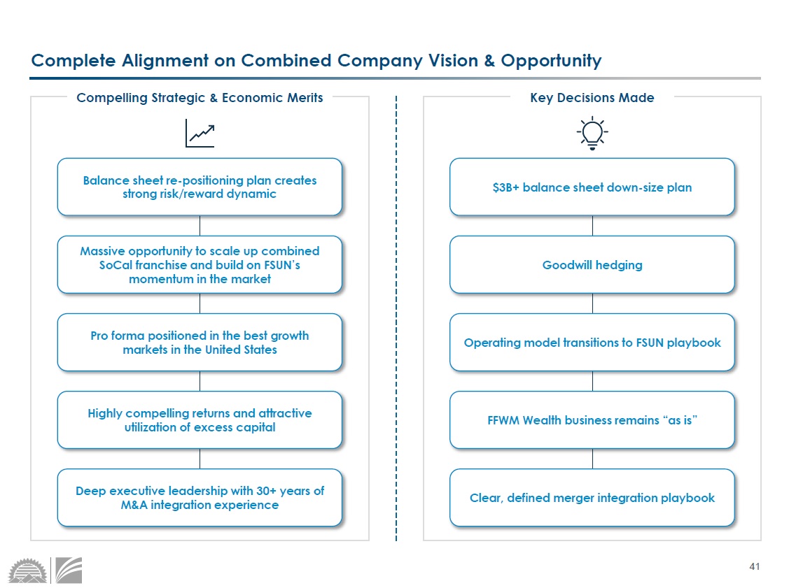 40 8.1% 5.3% $1 - $10B Sized Banks in 2018 9.8% 6.6% $1 - $10B Sized Banks in 2018 22.4% 4.6% $1 - $10B Sized Banks in 2018 TBV Per Share CAGR Source: S&P Global Market Intelligence, company documents. Note: All peers not shown; median consensus analyst estimates as o f 1 0/24/2025. Revenue Per Share CAGR 23.1% Core EPS CAGR FSUN’s Playbook Works: Best - in - Class Per Share Compounding CAGRs • FSUN has grown revenue and EPS materially faster than peers while protecting and growing TBV levels, even through a material acquisition of Pioneer Bank in 2022 (38% of pre - deal assets) • FSUN total assets at the announcement of the Pioneer Bank merger was $5.3 billion • Anticipated EPS growth rates projected to remain far above industry averages 2018YE - 2025Q2 CAGR 2018YE - 2025Q2 CAGR 2018YE - 2025Q2 CAGR 2025 - 2027 Projected EPS CAGR $13 - $30B Peer Median 11.0% 2025E - 2027E CAGR 41 Complete Alignment on Combined Company Vision & Opportunity Compelling Strategic & Economic Merits Key Decisions Made $3B+ balance sheet down - size plan Goodwill hedging Operating model transitions to FSUN playbook FFWM Wealth business remains “as is” Clear, defined merger integration playbook Balance sheet re - positioning plan creates strong risk/reward dynamic Massive opportunity to scale up combined SoCal franchise and build on FSUN’s momentum in the market Pro forma positioned in the best growth markets in the United States Highly compelling returns and attractive utilization of excess capital Deep executive leadership with 30+ years of M&A integration experience