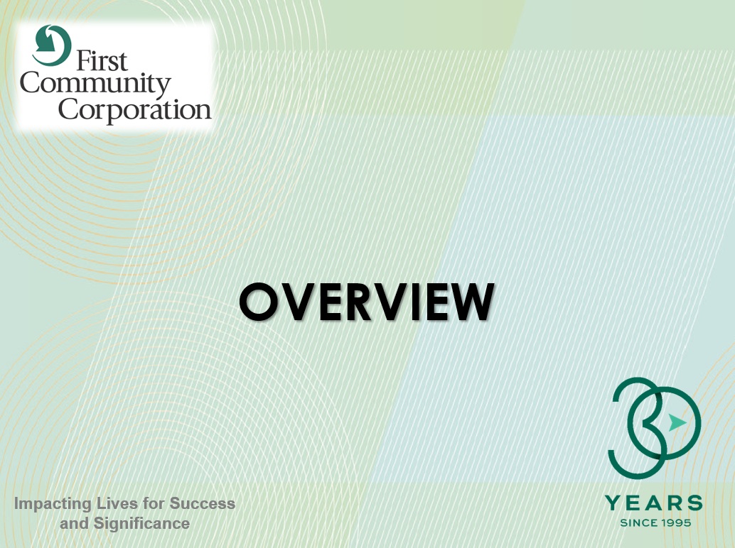 Core Net Income 1 / Core EPS 1 / Pre - Tax Pre - Provision Earnings NET INCOME Thousands 44 2 3 FORWARD - LOOKING STATEMENTS 45 SAFE HARBOR STATEMENT – In this presentation, unless the context suggests otherwise, references to “First Community,” the “Company” or “FCCO” refer to First Community Corporation and references to “we,” “us,” and “our” mean the combined business of the Company, First Community Bank (or “FCB”) and its wholly - owned subsidiaries . Any reference to “Signature Bank,” “Signature” or “ SGBG ” shall mean Signature Bank of Georgia . Additionally, unless otherwise noted, all Year - to - Date (YTD) figures refer to either September 30 , 2024 , or September 30 , 2025 , as indicated . This presentation and other written reports and statements made by us and our management from time to time may contain forward - looking statements . These statements include, without limitation, statements regarding our operating philosophy, growth plans and opportunities, strategies and financial performance, industry and economic trends and estimates and assumptions underlying accounting policies . Words such as “believe,” “expect,” “anticipate,” “intend,” “target,” “estimate,” “focus,” “continue,” “positions,” “plan,” “predict,” “project,” “forecast,” “guidance,” “goal,” “objective,” “prospects,” “possible” or “potential,” by future conditional verbs such as “assume,” “will,” “would,” “should,” “could” or “may,” or by variations of such words or by similar expressions are intended to identify such forward - looking statements . These forward - looking statements are subject to numerous assumptions, risks and uncertainties, which change over time, are difficult to predict and are generally beyond our control . Although we believe that the assumptions underlying the forward - looking statements are reasonable, any of the assumptions could prove to be inaccurate . Therefore, we can give no assurance that the results contemplated in the forward - looking statements will be realized . The inclusion of this forward - looking information should not be construed as a representation by the Company or any other person that such future events, plans, or expectations will occur or be achieved . In addition to factors previously disclosed in the reports filed by us with the US Securities and Exchange Commission (the “SEC”), additional risks and uncertainties may include, but are not limited to : ( 1 ) the possibility that the planned acquisition of Signature Bank may not be completed in a timely manner or at all ; ( 2 ) failure to obtain required shareholder or regulatory approvals in connection with the planned acquisition ; ( 3 ) the risk that anticipated cost savings or other expected benefits of the planned acquisition may not be realized ; ( 4 ) potential disruption to client or employee relationships as a result of the planned acquisition ; ( 5 ) competitive pressures among depository and other financial institutions may increase significantly and have an effect on pricing, spending, third - party relationships and revenues ; ( 6 ) the strength of the United States economy in general and the strength of the local economies in which we conduct operations may be different than expected ; ( 7 ) the rate of delinquencies and amounts of charge - offs, the level of allowance for credit loss, the rates of loan growth, or adverse changes in asset quality in our loan portfolio, which may result in increased credit risk - related losses and expenses ; ( 8 ) changes in legislation, regulation, policies or administrative practices, whether by judicial, governmental, or legislative action ; ( 9 ) adverse conditions in the stock market, the public debt markets and other capital markets (including changes in interest rate conditions) could continue to have a negative impact on the company ; ( 10 ) changes in interest rates, which have and may continue to affect our deposit and funding costs, net income, prepayment penalty income, mortgage banking income, and other future cash flows, or the market value of our assets, including our investment securities ; ( 11 ) technology and cybersecurity risks, including potential business disruptions, reputational risks, and financial losses, associated with potential attacks on or failures by our computer systems and computer systems of our vendors and other third parties ; ( 12 ) elevated inflation which causes adverse risk to the overall economy, and could indirectly pose challenges to our customers and to our business ; ( 13 ) any increases in FDIC assessment which has increased, and may continue to increase, our cost of doing business ; and ( 14 ) the adverse effects of events beyond our control that may have a destabilizing effect on financial markets and the economy, such as epidemics and pandemics, war or terrorist activities, essential utility outages, deterioration in the global economy, instability in the credit markets, disruptions in our customers’ supply chains or disruption in transportation Additional factors that could cause results to differ materially from those described in the forward - looking statements can be found in our reports (such as the annual report on Form 10 - K, quarterly reports on Form 10 - Q and current reports on Form 8 - K) filed with the SEC and available at the SEC’s internet site (http : //www . sec . gov) . All subsequent written and oral forward - looking statements by us or any person acting on our behalf is expressly qualified in its entirety by the cautionary statements above . The foregoing review of important factors should not be construed as exhaustive and should be read in conjunction with other cautionary statements that are included herein . We undertake no obligation to update or revise any forward - looking statement, whether as a result of new information, future events 