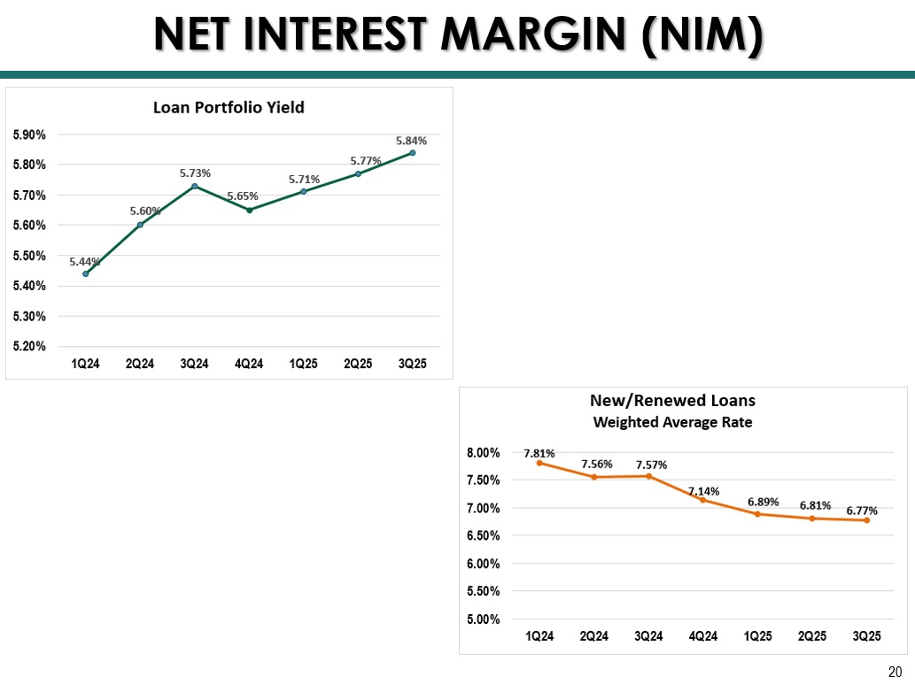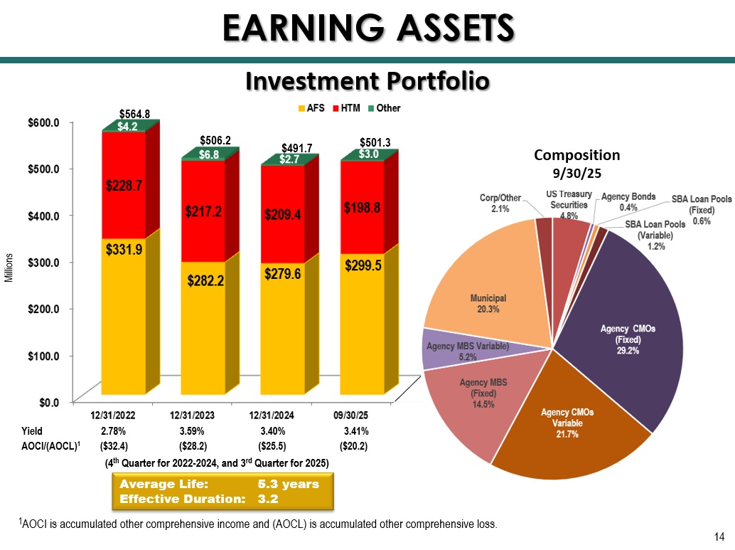 Yield 4.43% 5.32% 5.65% 5.84% Loan Portfolio 2025 YTD Annual Growth = 6.4% CRE as a % of RBC = 304.3% (4 th Quarter for 2022 - 2024 and 3 rd Quarter for 2025) 12 EARNING ASSETS Composition 9/30/25 Millions » 3Q25 $19.3 million 6.1% annualized growth rate » YTD 2025 $58.8 million 6.4% annualized growth rate Notes: » Percent of Growth : YTD25 ▪ CRE 56.9% ▪ C&I 6.4% ▪ Residential Mortgage 22.1% ▪ Other 14.6% » Interest Rate Sensitivity (9/30/25) : ▪ Principal cash flows, excluding prepayment estimates • 10/01/25 – 12/31/25 = $66.0 million at a weighted average rate of 5.70% • 2026 = $180.2 million at a weighted average rate of 5.55% 13 Loan Portfolio Growth EARNING ASSETS Yield 2.78% 3.59% 3.40% 3.41% AOCI/(AOCL) 1 ($32.4) ($28.2) ($25.5) ($20.2) Investment Portfolio (4 th Quarter for 2022 - 2024, and 3 rd Quarter for 2025) Average Life: 5.3 years Effective Duration: 3.2 $564.8 $506.2 EARNING ASSETS Millions $491.7 14 1 AOCI is accumulated other comprehensive income and (AOCL) is accumulated other comprehensive loss.